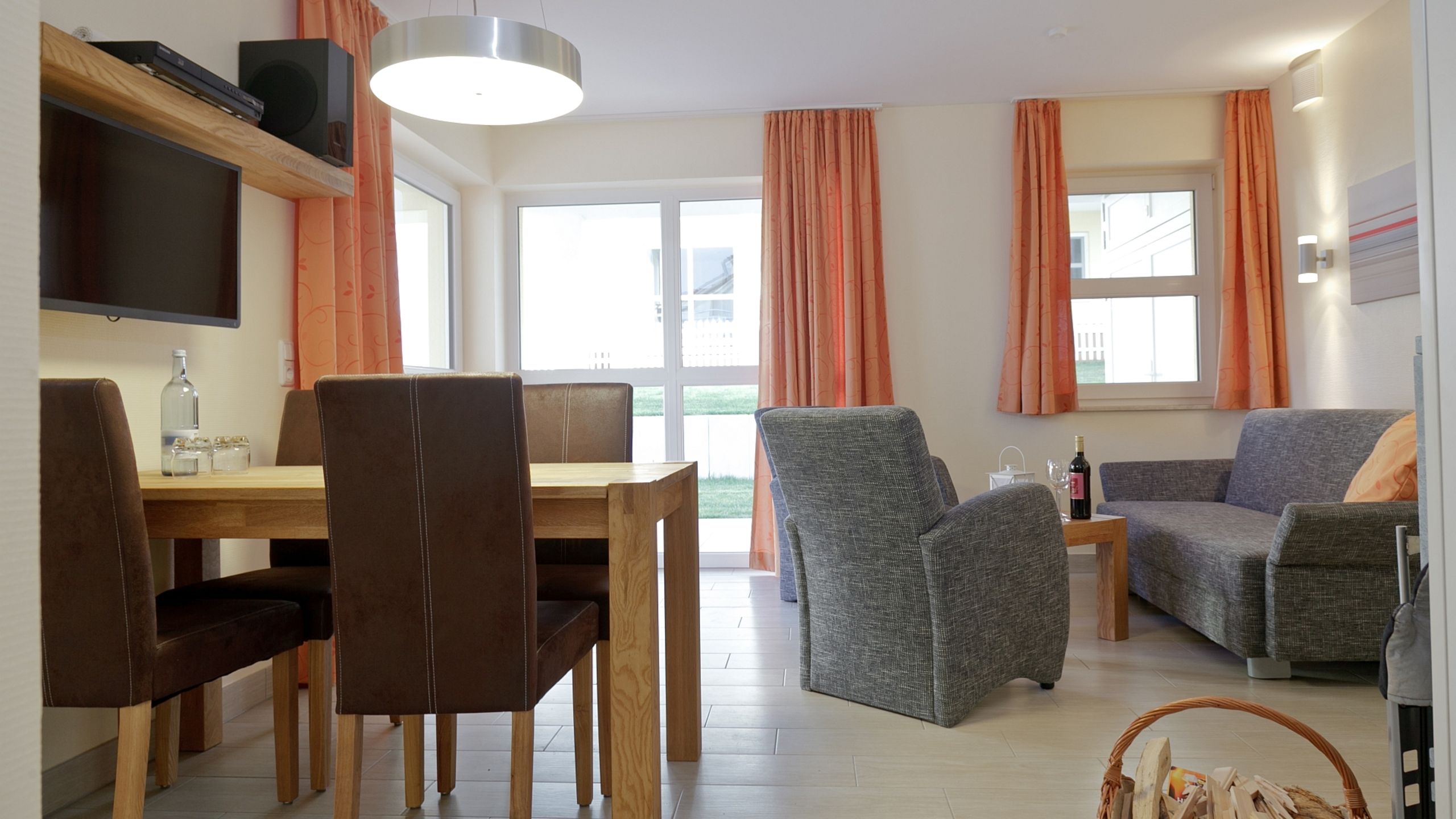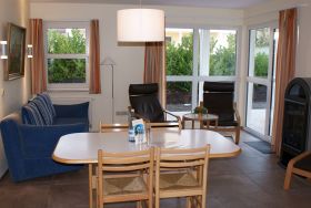 68 m² im EG für 2-5 Personen, 1 Schlafzimmer mit Qualitätsbett, 1 Kinderschlafzimmer mit Einzelbett oder Etagenbett, 1 Schlafcouch im Wohnzimmer, Diele, Bad inkl. privater Sauna, Dusche und Eck-Whirlwanne, WC separat. Wohnzimmer mit HDTV, BluRay und Kaminofen oder E-Kamin, möblierte Terrasse, freier WLAN Empfang, Safe. Empfohlene Belegung 3 Erwachsene oder 2 Erwachsene und 2 Kinder.