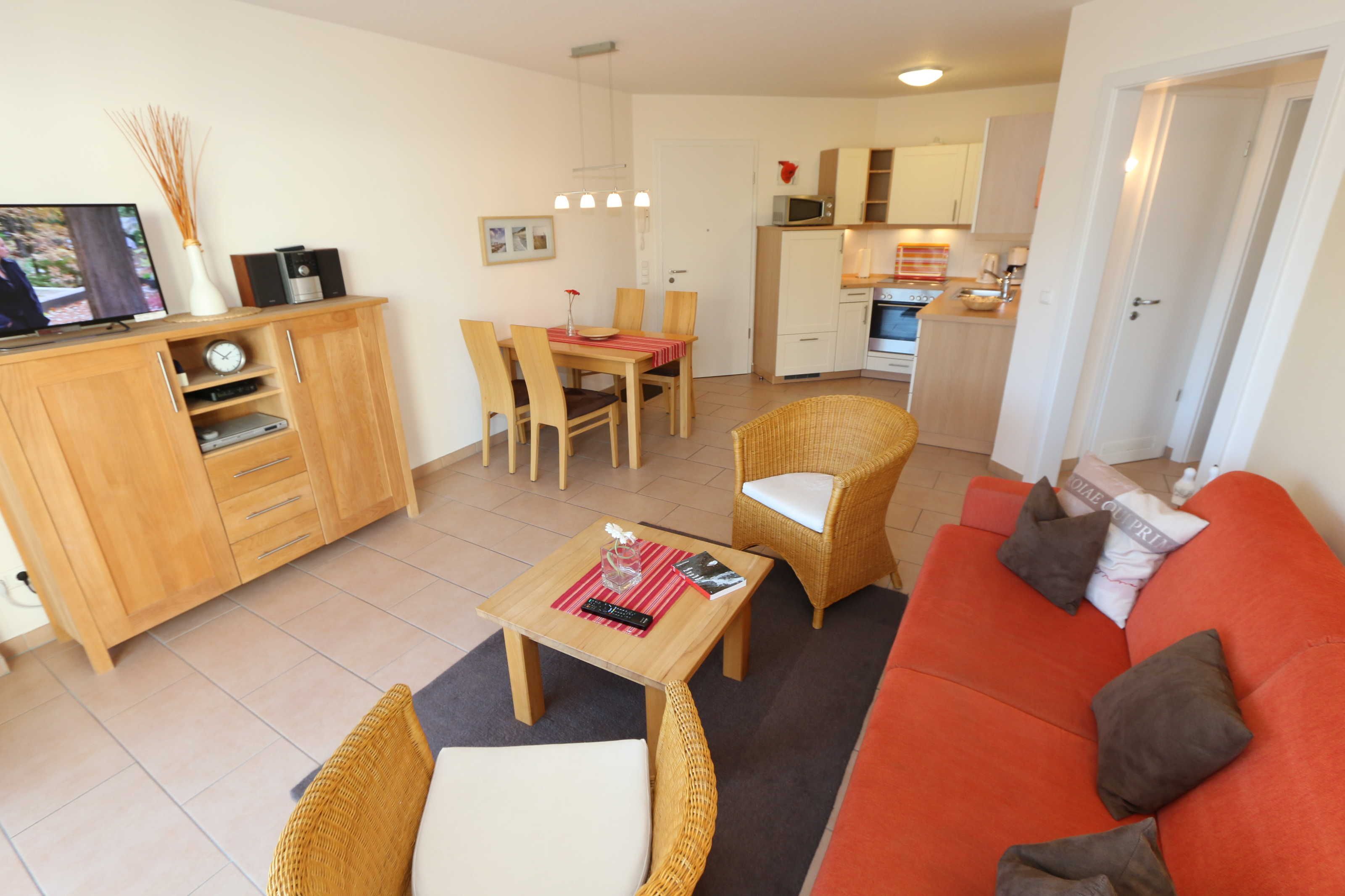 Sie wohnen in einer modern und hochwertig eingerichteten 2-Zimmer-Nichtraucherwohnung. Bei einer Wohnungsgröße von ca. 50m² haben 2 bis 4 Personen ausreichend Platz. Vom Eingangsbereich aus gelangen Sie in einen großzügigen, lichtdurchfluteten Wohn- und Essbereich. Der Wohnbereich ist mit einem Sideboard, Leselampe, Smart-TV, DVD-Player, Stereoanlage, einer gemütlichen Couch (hochwertige Ausziehfunktion mit separater Matratze 1,60 m x 2,00 m) mit Couchtisch ausgestattet. Auch auf einen Internetanschluss (WLAN) müssen Sie im Urlaub nicht verzichten. Dieser ist für unsere Gäste inklusive! Die komplett ausgestattete Küchenzeile wird durch einen Geschirrspüler, Backofen, Mikrowelle, Kühlschrank mit Gefrierfach, Kaffeemaschine, Toaster, Wasserkocher, Eierkocher, kleine Küchenutensilien sowie durch eine Essgruppe mit 4 Stühlen abgerundet. Angrenzend liegt das Schlafzimmer mit einem Doppelbett (1,80m x 2,00m, 7 Zonen-Kaltschaummatratze), verstellbare Lattenroste, einem geräumigen Kleiderschrank, Insektenschutzgitter, LCD-TV und zusätzlicher Kommode. Für einen ruhigen Schlaf können Sie den Raum abdunkeln. Das Badezimmer ist mit Dusche, Waschtisch, WC, Kosmetikspiegel, Fön, Insektenschutzgitter und beheizbaren Handtuchhalter/Fußbodenheizung sowie einem Einbauradio ausgestattet. Im separaten Abstellraum finden Sie einen Wäscheständer, Bügeleisen sowie ein Bügelbrett, Reinigungsutensilien und ein Schuhschrank. Auf der teilweisen überdachten Terrasse (Osten), die sowohl vom Wohnbereich wie auch vom Schlafzimmer erreichbar ist, befindet sich eine Sitzgruppe und eine Sonnenliege. Hier können Sie den angrenzenden Garten von ca. 60m² frei nutzen. Haustiere sind nicht erlaubt. Für unsere kleinen Gäste steht Ihnen ein Kinderreisebett (ohne Matratze, ohne Bettinlett) inklusive zur Verfügung. Einen PKW-Stellplatz (Nr.1, Einfahrtshöhe 2,10m) finden Sie in der Tiefgarage des Hauses. Ihre geliehenen oder auch mitgebrachten Fahrräder können Sie im eigenen abschließbaren Kellerraum unterstellen. Im Gemeinschaftskeller können Sie gegen einen Aufpreis die gemeinschaftliche Waschmaschine und den Trockner nutzen. Die Wertmarken können Sie auf Nachfrage während Ihres Urlaubes erwerben. Die Erstausstattung eines Wäschepaketes (komplette Bettwäsche, 1 Duschhandtuch, 1 kleines Handtuch) können Sie bis 14 Tage vor Anreise gegen einen Aufpreis dazu buchen oder durch eigene ergänzen. Ab 2 gebuchten Paketen erhalten Sie einmalig 1 Geschirrhandtuch und 1 Duschvorleger hinzu.