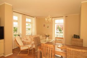 Sie wohnen in einer ca. 75 m² großen 3-Raum-Ferienwohnung, die sich im 2. Obergeschoss der Villa Josephine befindet. Der liebevoll eingerichtete helle Wohnraum ist ausgestattet mit einer gemütlichen Couchgarnitur, einem großzügigen Essplatz sowie einem 42-Zoll-Flachbild-TV.