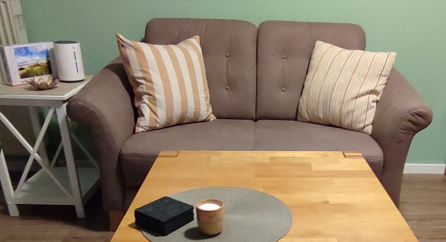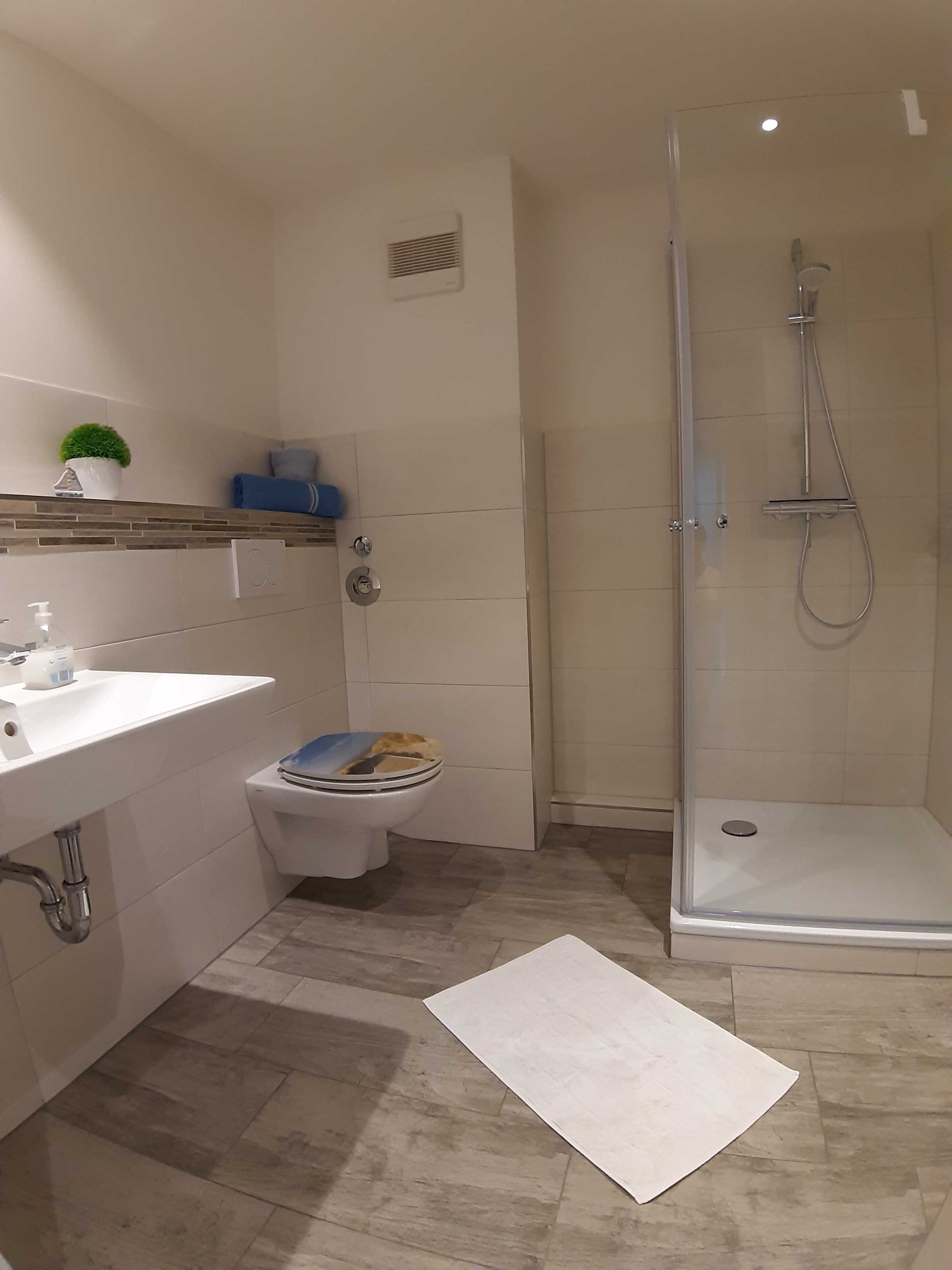Ein gemütliches Sofa und der Essplatz laden zum Verweilen ein. Das Bad ist mit Dusche und WC ausgestattet.