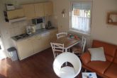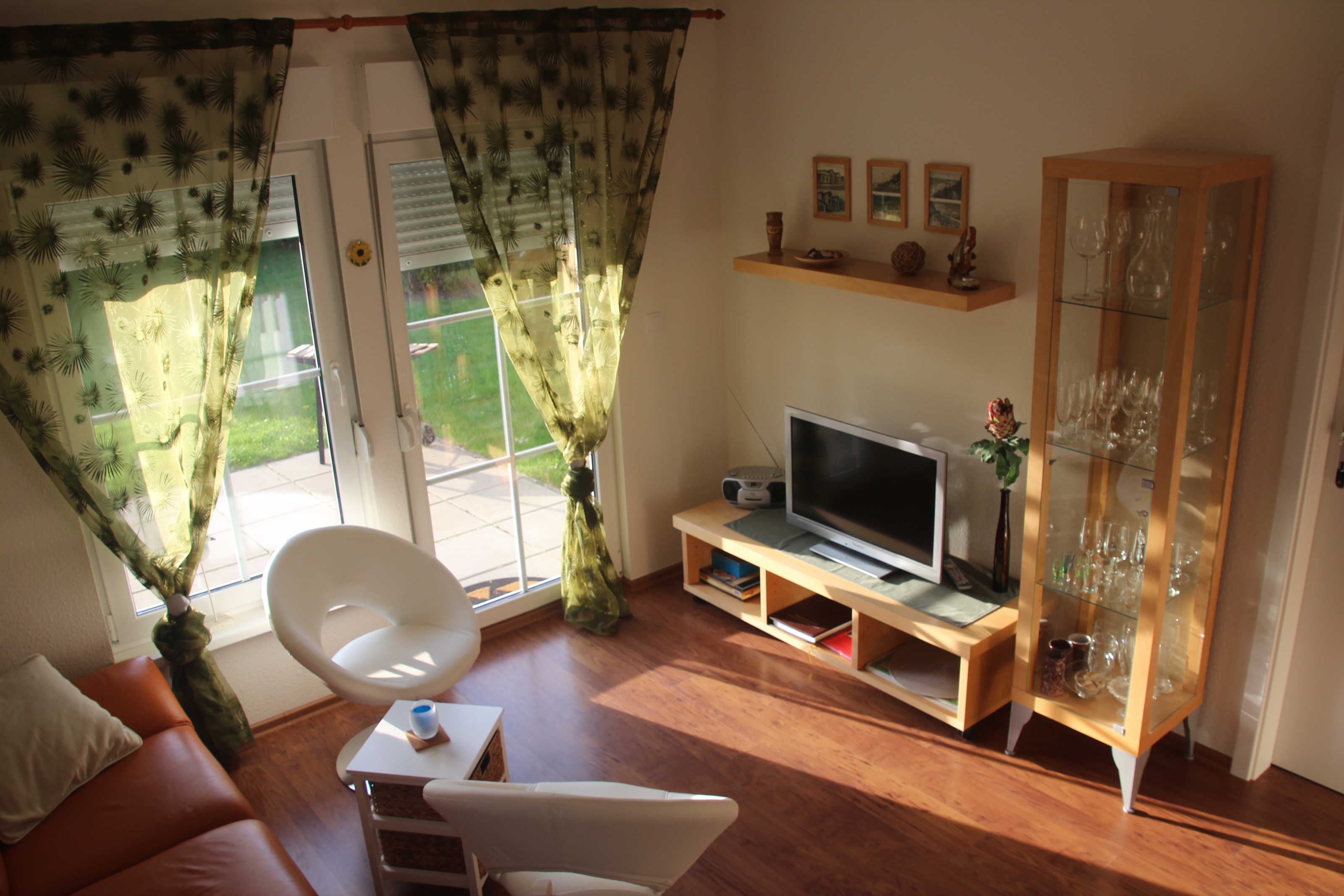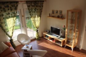 3-Zimmer Ferienwohnung im Erdgeschoss einer liebevoll angelegten Ferienanlage. Die Ferienwohnung ist im Wohnbereich ausgestattet mit einer gemütlichen Couch und einer offenen Küche mit Essbereich.