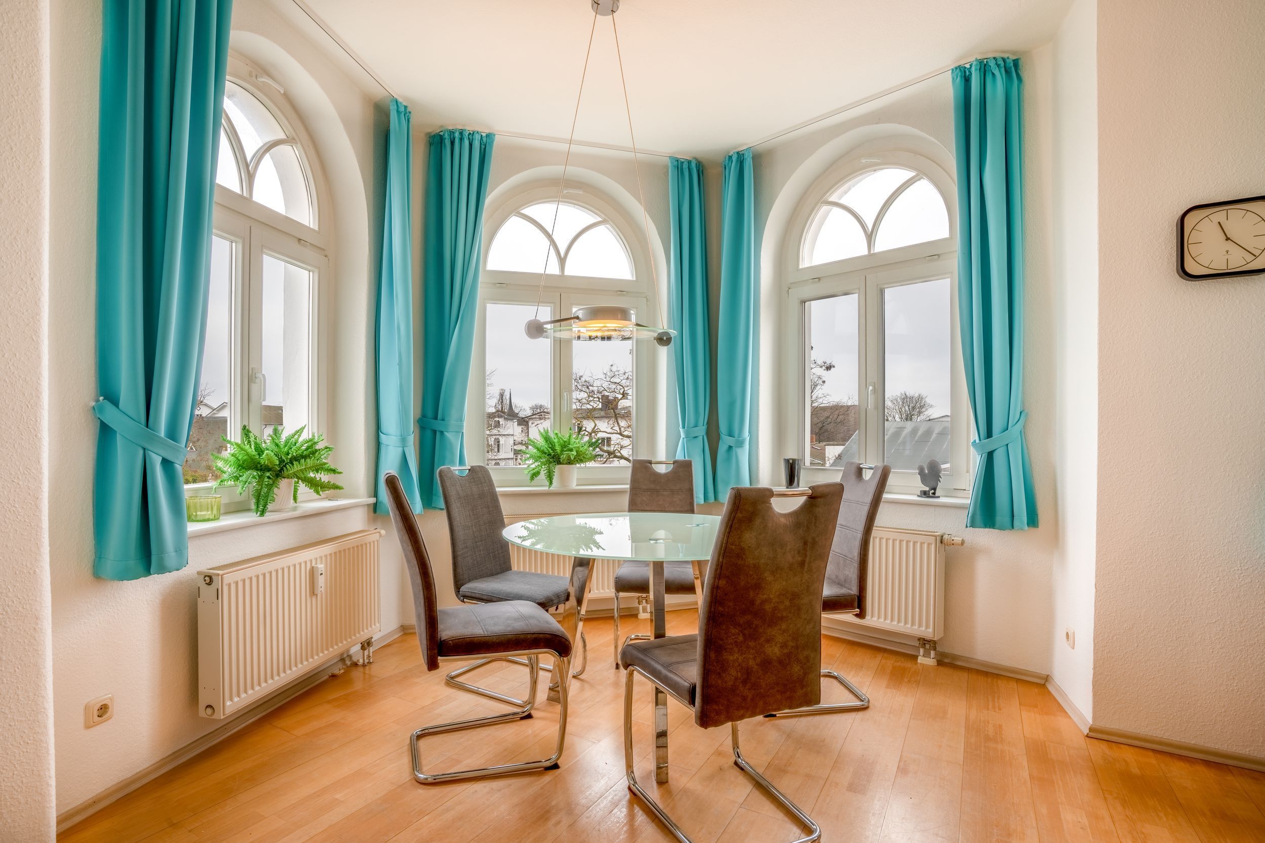 Das Apartment empfängt Sie mit einer freundlichen, lichtdurchfluteten Atmosphäre. Im Wohnbereich sorgt eine bequeme Schlafcouch mit hochwertiger Matratze für erholsame Nächte, während der gemütliche Essplatz im Erker ideal ist, um gemeinsame Mahlzeiten zu genießen. Hier können Sie den Tag entspannt ausklingen lassen ob beim Essen, Lesen oder vor dem TV.
