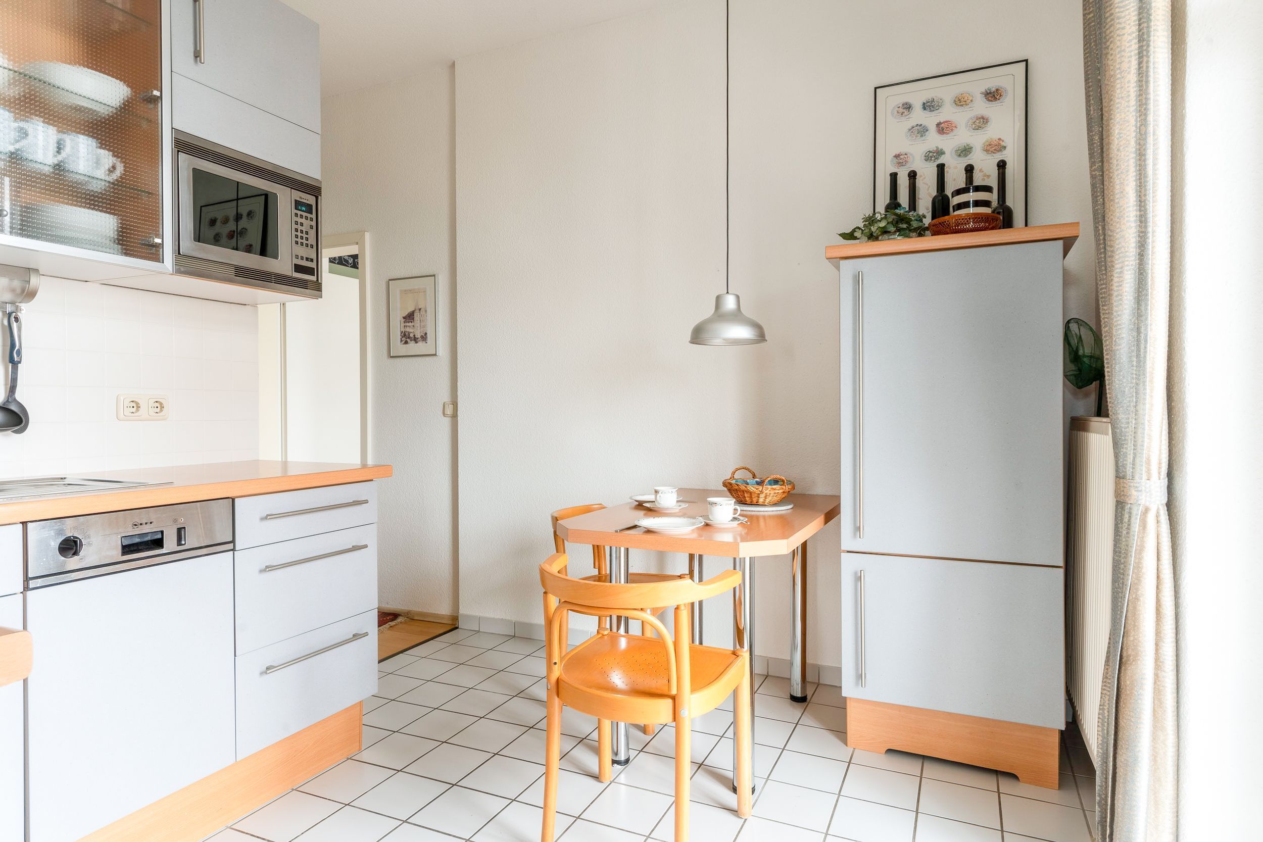 Die voll ausgestattete Küche lässt keine Wünsche offen und bietet direkten Zugang zum Balkon perfekt für ein Frühstück an der frischen Luft. Das moderne Duschbad rundet das komfortable Wohnambiente ab.