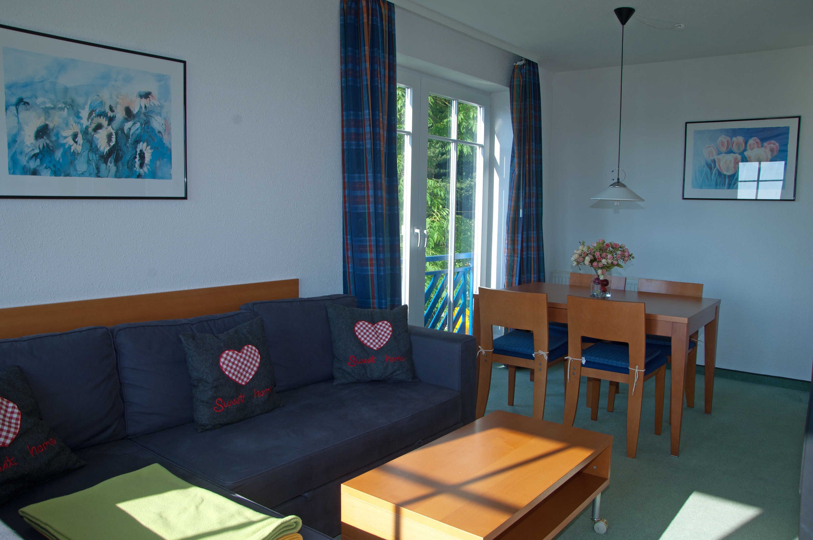 Im Wohnbereich befinden sich eine bequeme Sitzcouch, ausklappbar und als Bett für 2 Pers. nitzbar. Tisch und ein modernes TV-Gerät mit Kabelanschluss und kostenloses Wlan