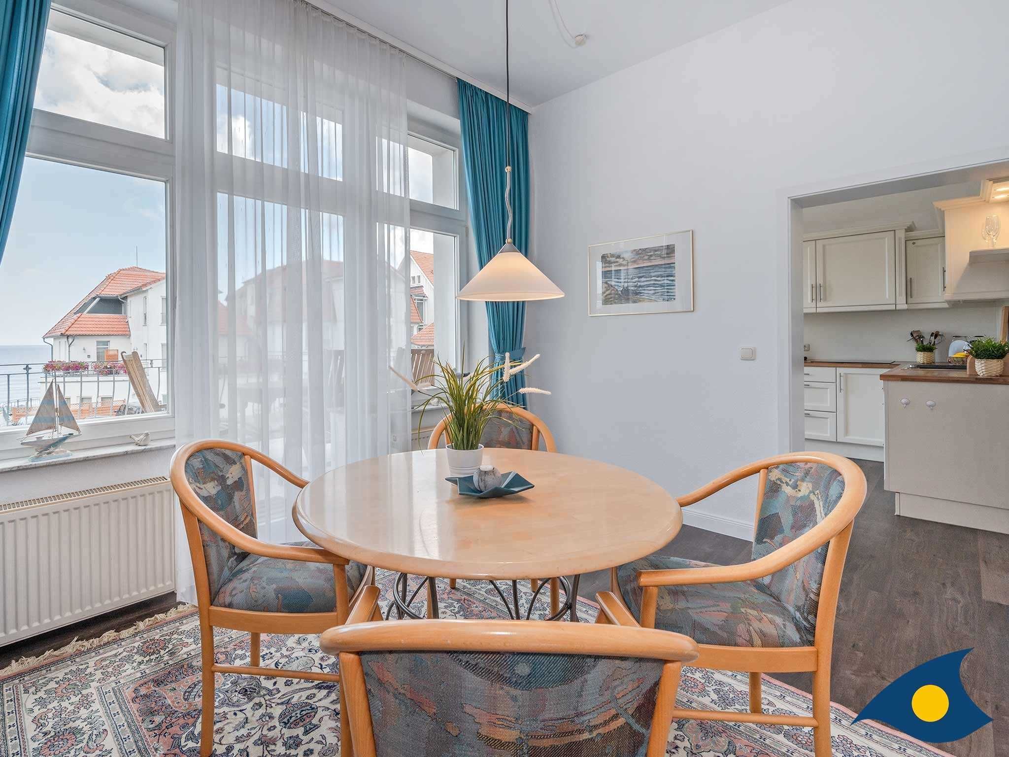 Das Erkerzimmer ist das Wohnzimmer des Appartements und lädt zum Lesen eines spannenden Buches oder zum Schreiben der Urlaubsgrüße ein.