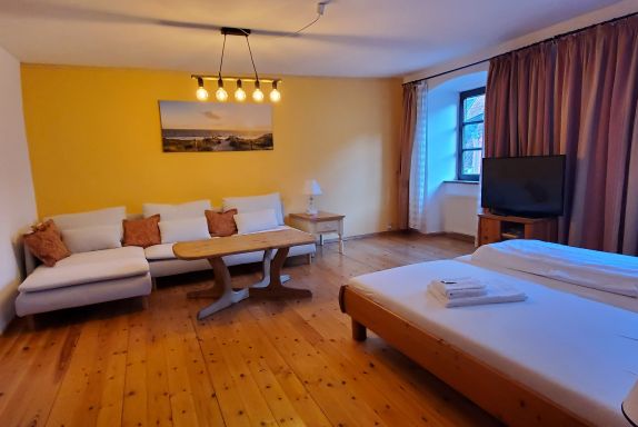 Die Wohnung 3, Kapitänsdeck backbord, befindet sich im 2. Obergeschoss links und hat ca. 65 qm, mit 1 Schlafzimmer mit Doppelbett (und der Option eines Zustellbettes) sowie einem Wohnzimmer mit vollwertigem Doppelbett plus einer gemütlichen Sitzgarnitur.