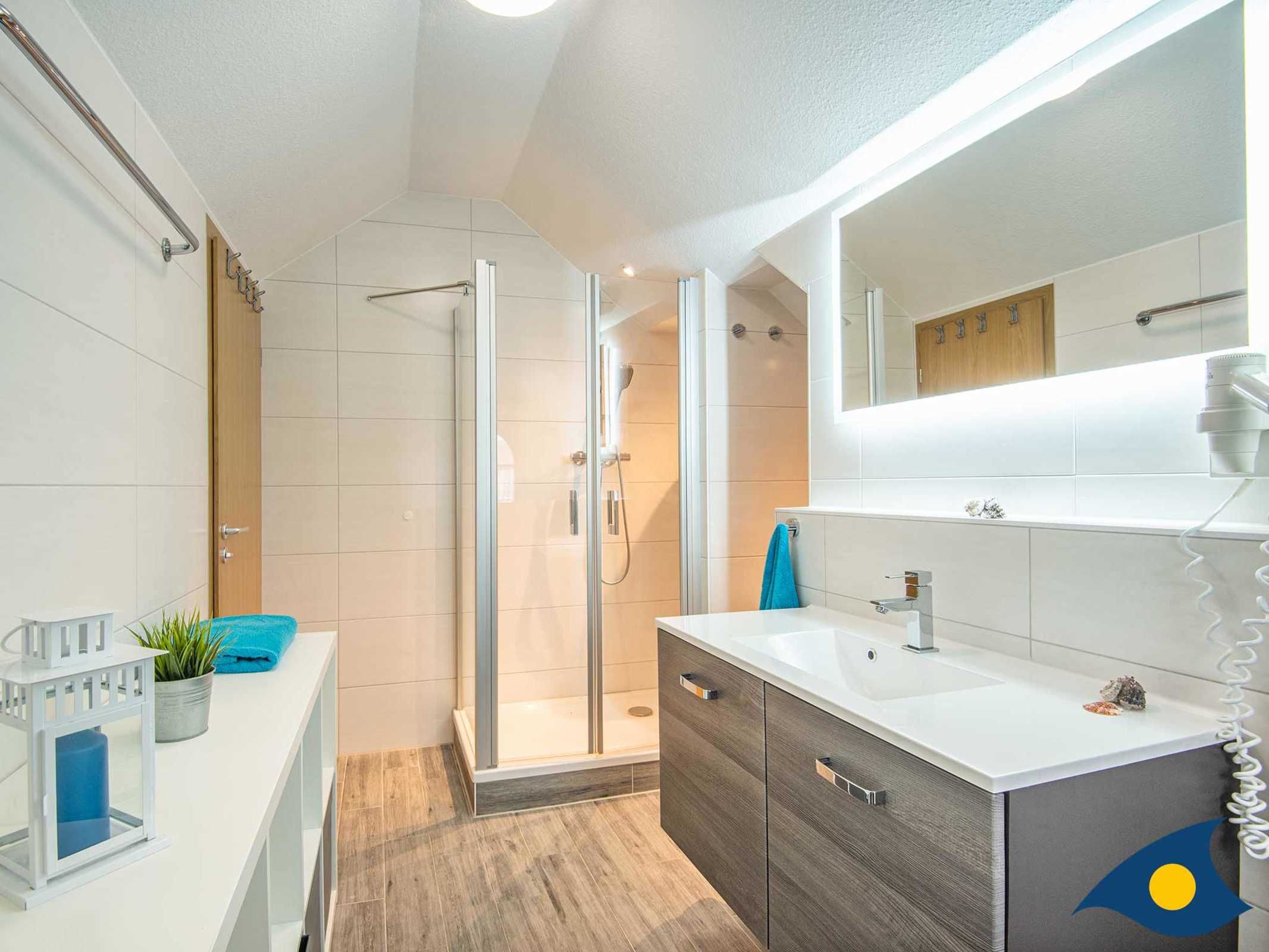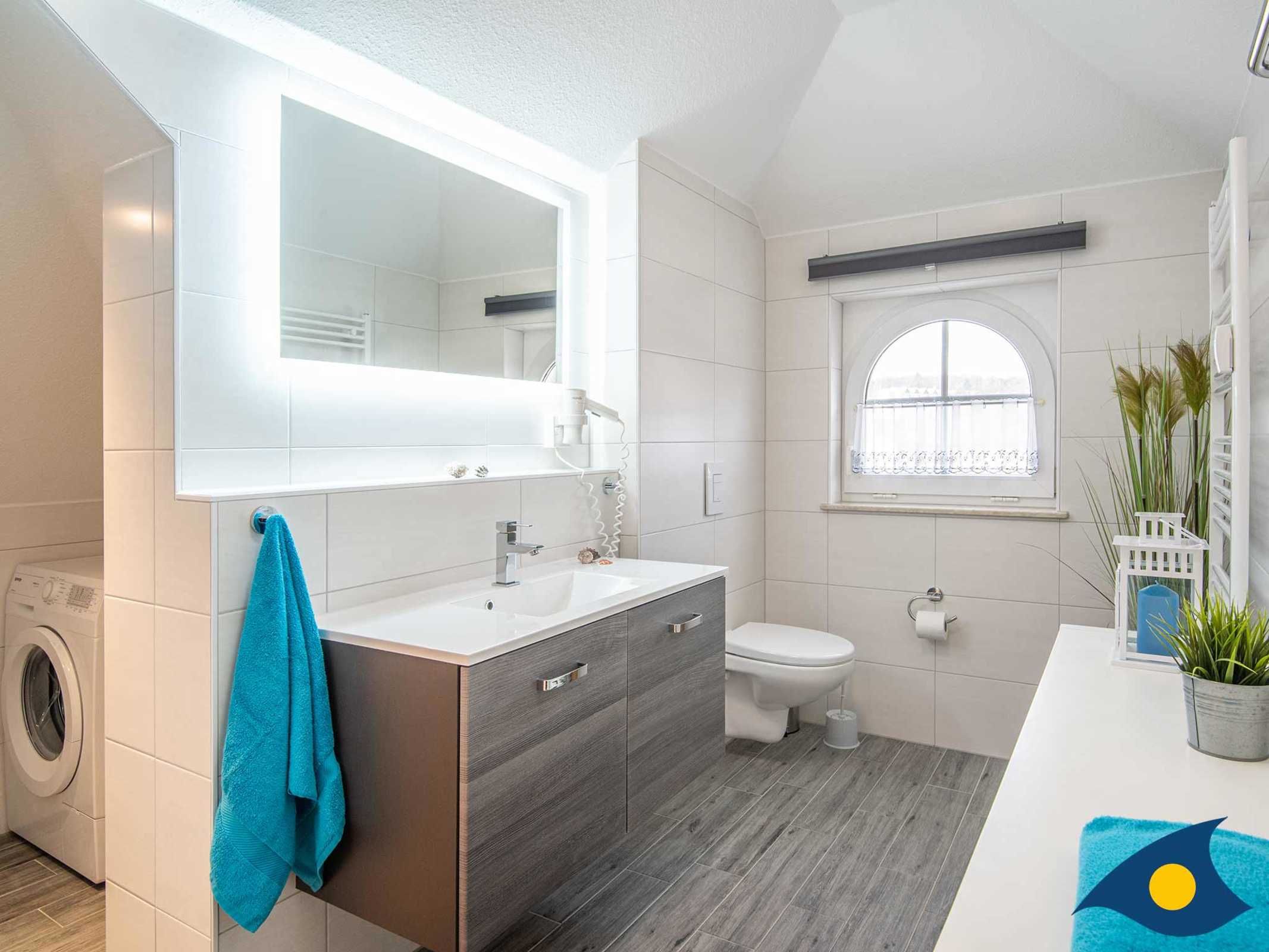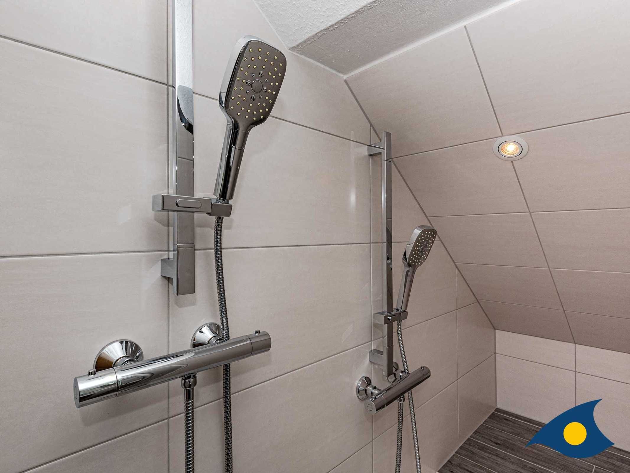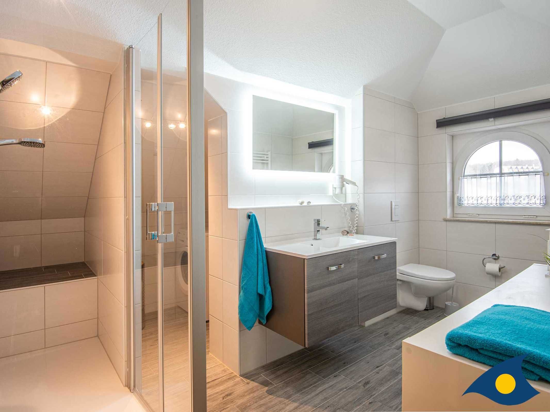 Im neu renovierte Badezimmer erwartet Sie eine neue Duschkabine mit zwei separaten Duschbrausen für unsere großen und kleinen Gäste. Außerdem ist das moderene Duschbad ausgestattet mit WC, Fenster, Kosmetikspiegel, Fön und Waschmaschine.