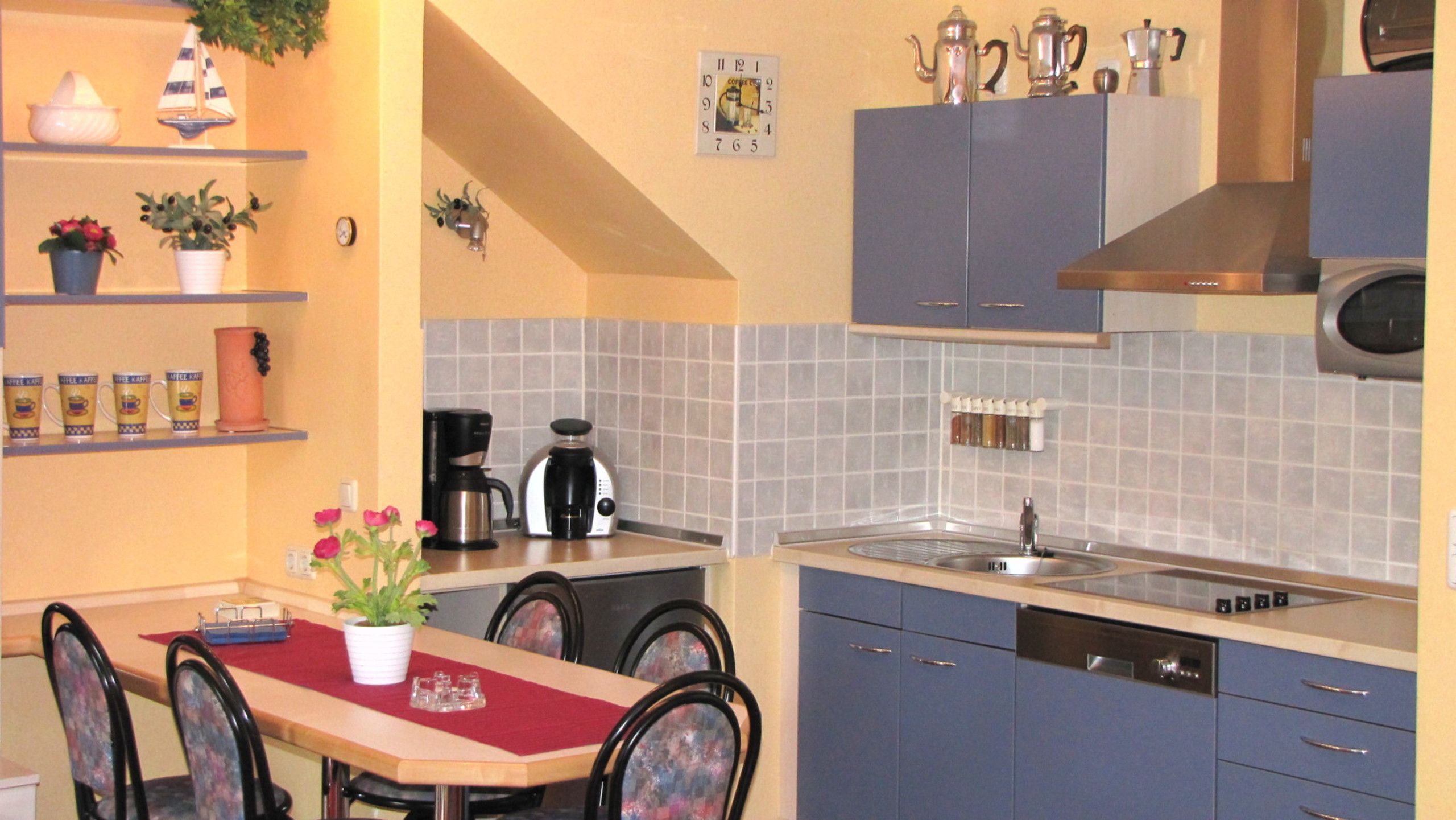 Die Küchenzeile mit dem davor befindlichen Essplatz ist unter anderem ausgestattet mit Spülmaschine, Cerankochfeld, Dunstabzug, Wasserkocher, Toaster, Kaffeemaschine, Espressomaschine (Tassimo), Mikrowelle und natürlich reichhaltigem Zubehör sowie mehr als ausreichendem Geschirr und Besteck.