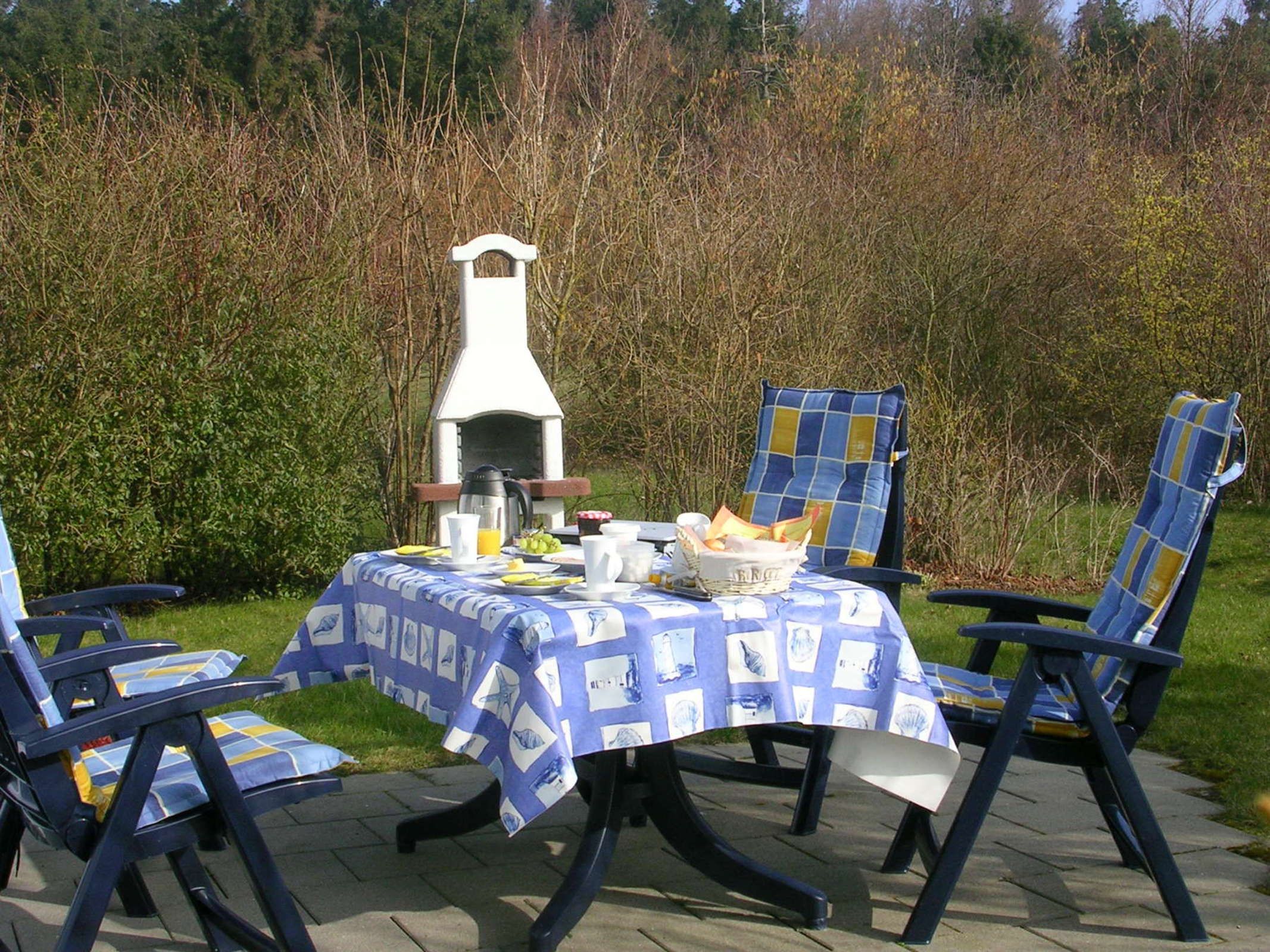 Die Terrasse ist vom Wohnraum aus zu erreichen. Sie ist durch Bewuchs vor den Einblicken Fremder ziemlich abgeschottet. Hier finden Sie Gartenmöbel und eine Grillkamin.