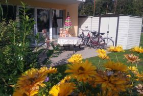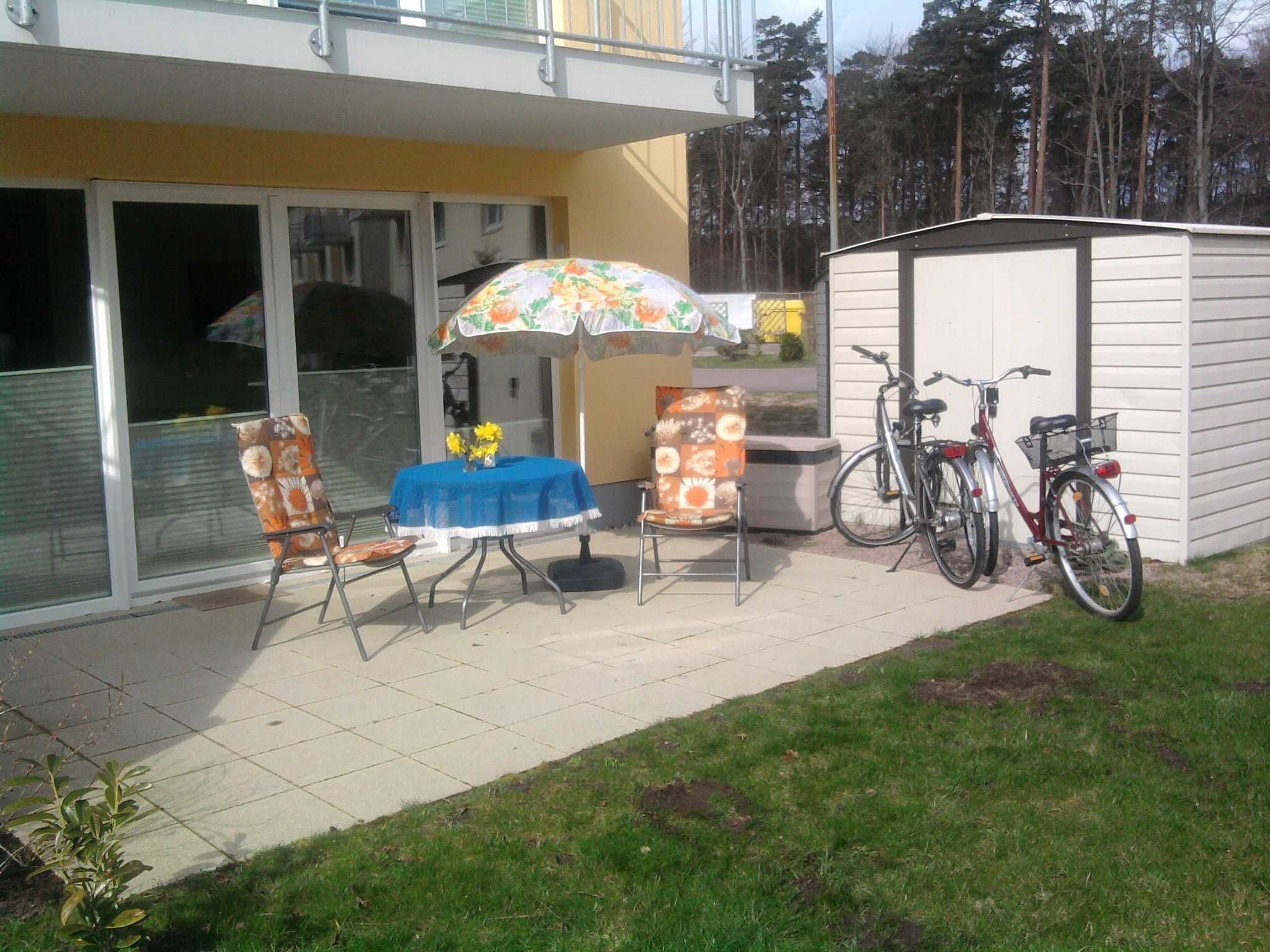 kostenloser Parkplatz vor der FeWo - Abstellschuppen neben der Terrasse