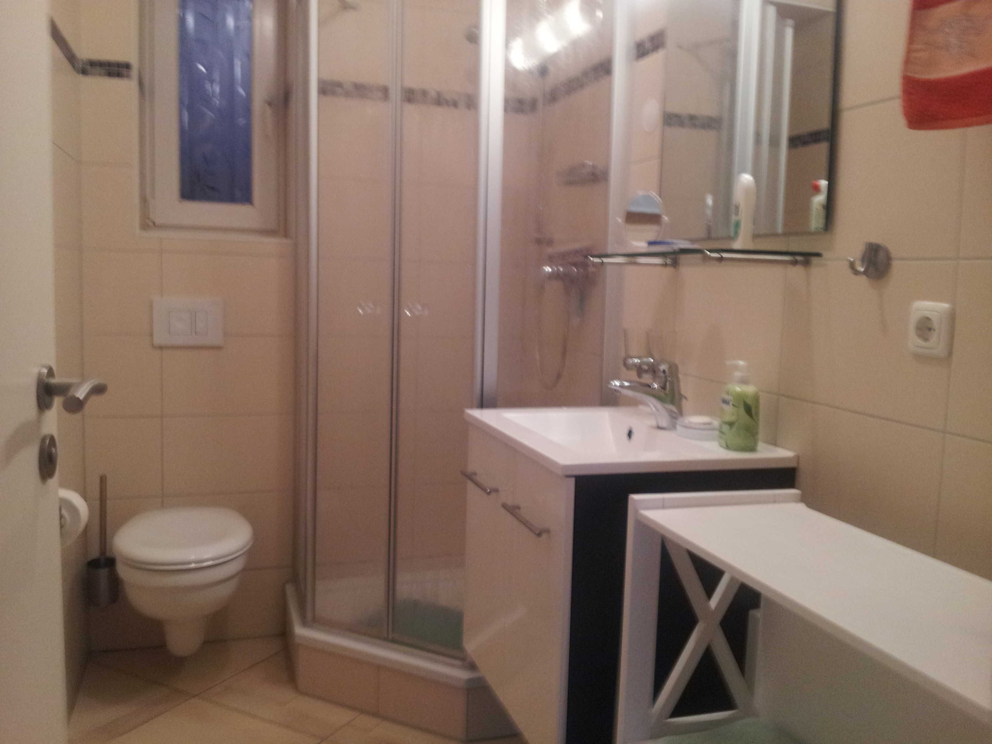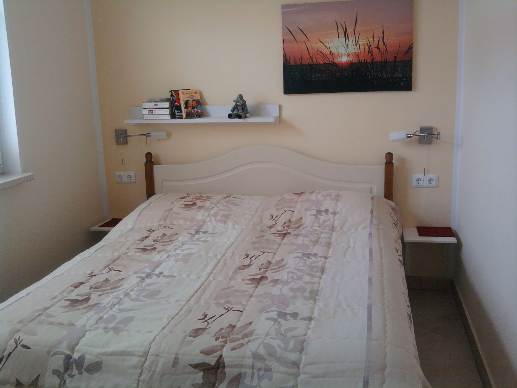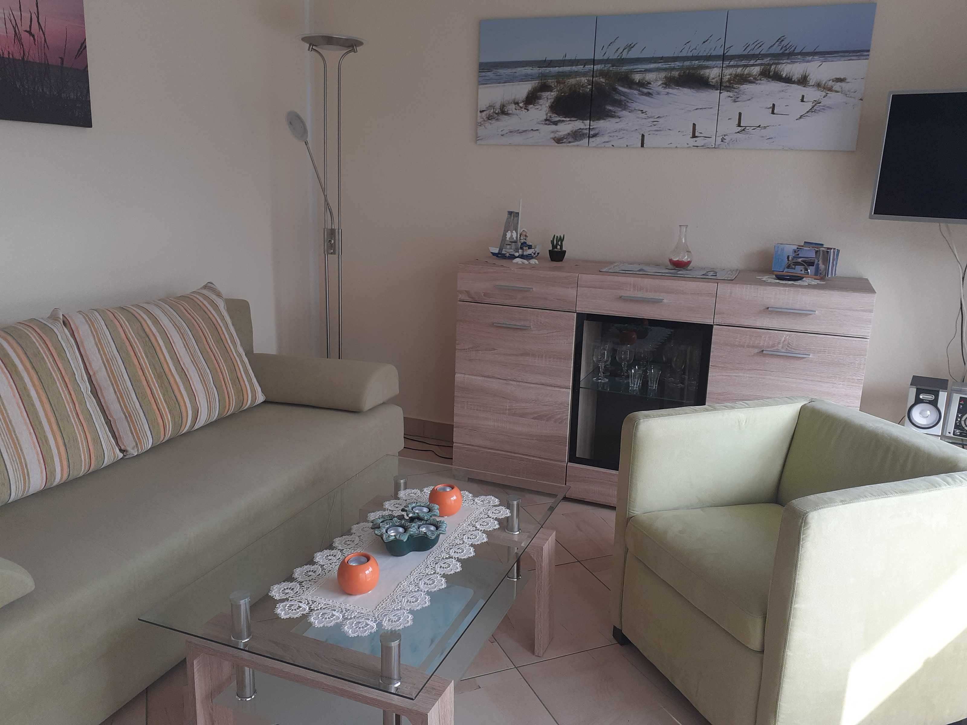 44 qm Nichtraucher-Ferienwohnung, Fußböden gefließt - Fußbodenheizung , große Verglasung, im Wohnbereich ist eine Doppelbettcouch - kleines Bad mit Dusche und WC - Im Schlafzimmer befindet sich ein Doppelbett 160 x200