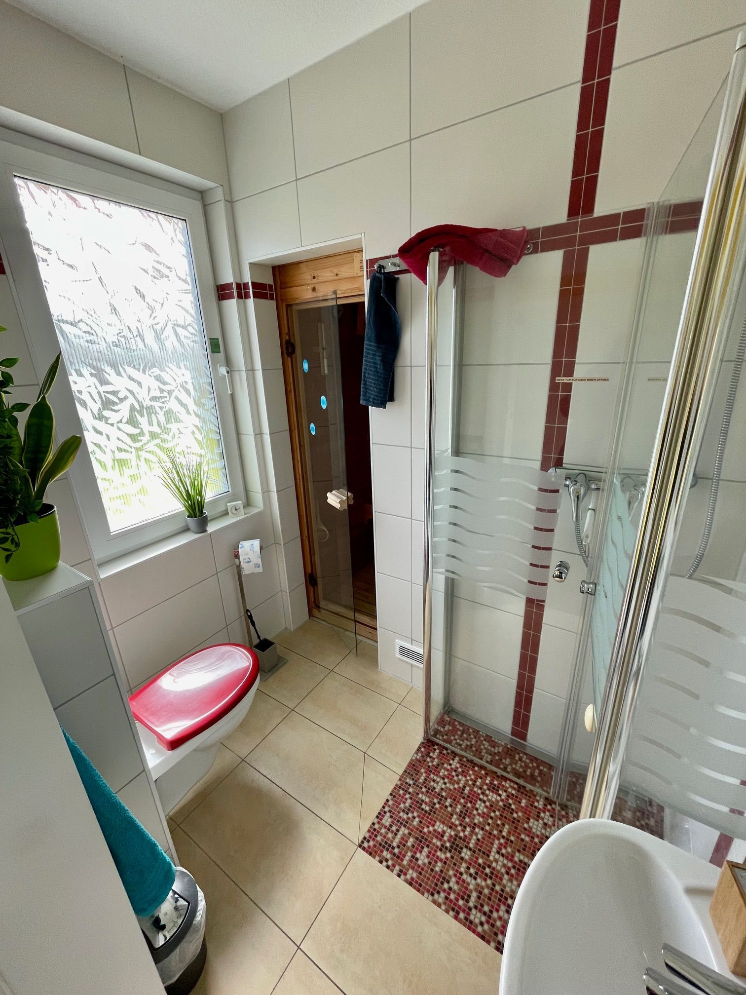 Weiterhin befindet sich dort ein Badezimmer mit Toilette und Dusche sowie einer Sauna.