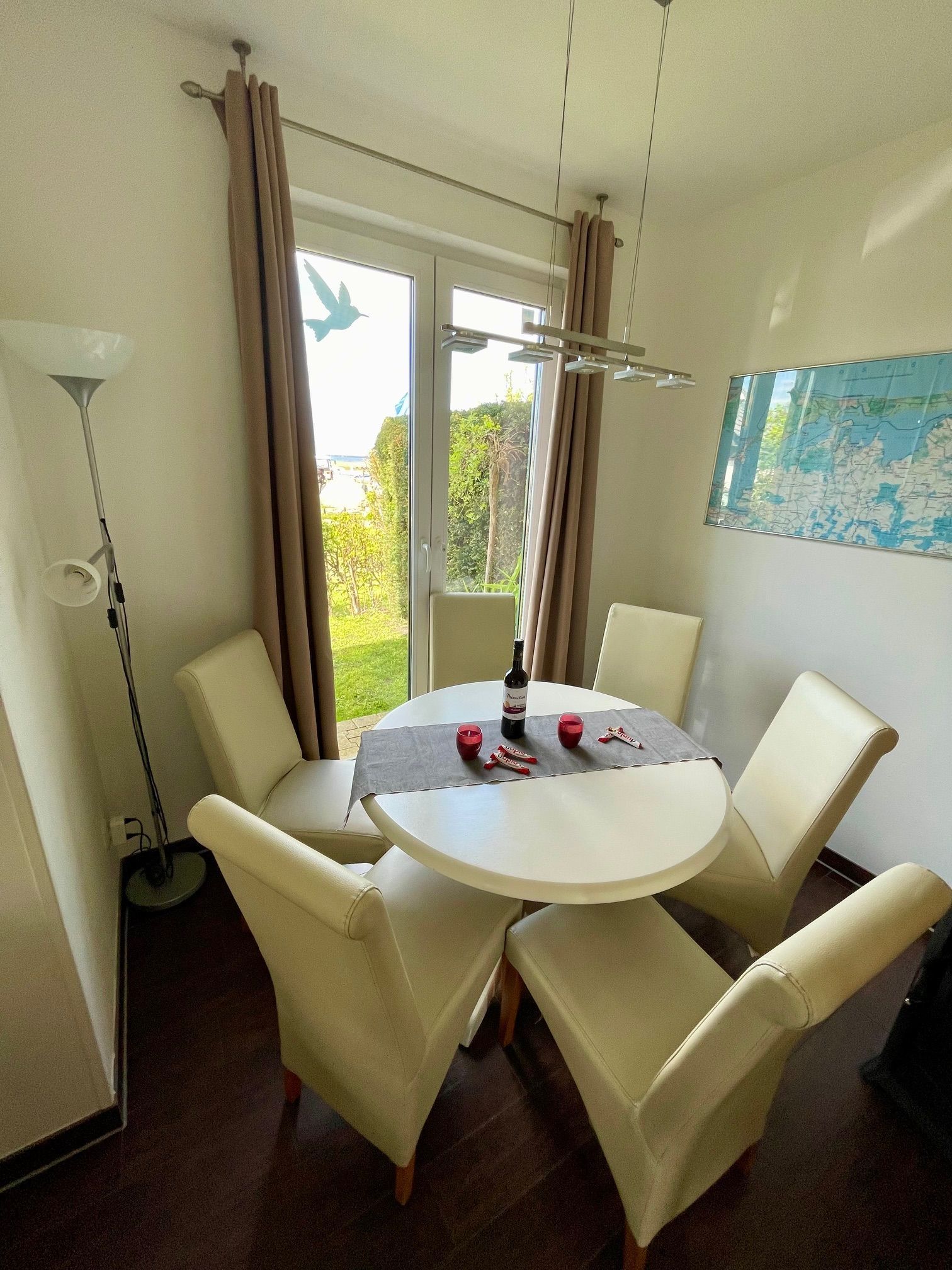 ine hochwertig ( **** DTV ) ausgestattete Doppelhaushälfte ( Baujahr 2010 ) - 85qm - für 6 (2) Personen mit 3 Schlafzimmern, 2 Bädern, Sauna und Kamin. Das Haus hat Wasserblick und verfügt über 2 Terrassen. Es stehen 3 separate Schlafzimmer zur Verfügung, wovon 2 SZ mit Doppelbetten und 1 SZ mit einem Doppelbett im Alkoven (Schlafboden) ausgestattet ist. Die beiden Bäder sind mit Toilette und Waschbecken sowie 1x mit Dusche und 1x mit Wanne ausgestattet. Von einem Bad hat man außerdem den Zugang zur Sauna. Das Haus ist ideal für Angler, Surfer, Segler, Kiter, Radfahrer und Naturfreunde. Weiterhin können Fahrräder kostenlos genutzt werden und ein Ruderboot kostenpflichtig gemietet werden. Der Naturstrand befindet sich in 50m Entfernung. WLAN ist vorhanden.Die Gemeinde erhebt eine Kurabgabe pro Person/ Nacht.