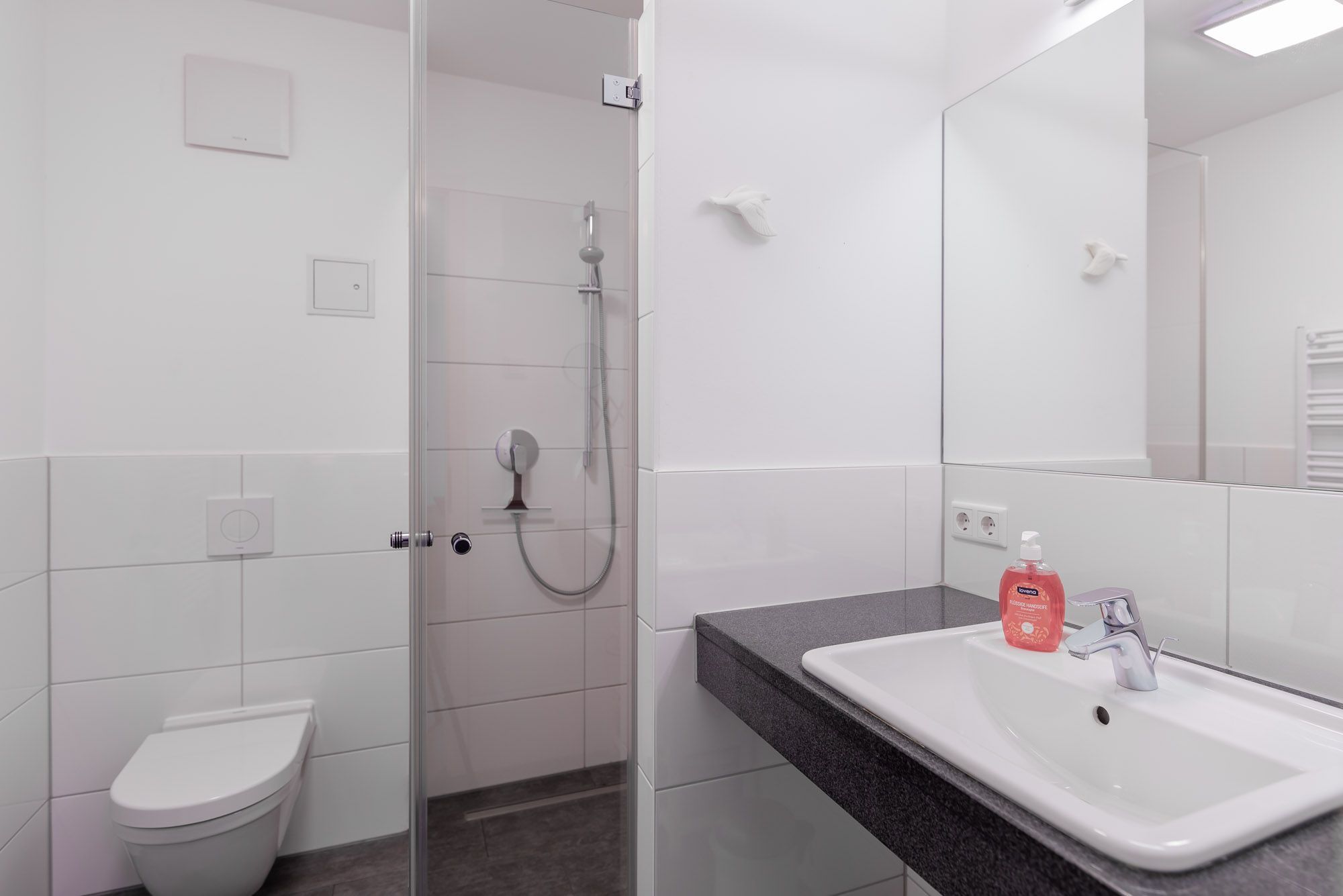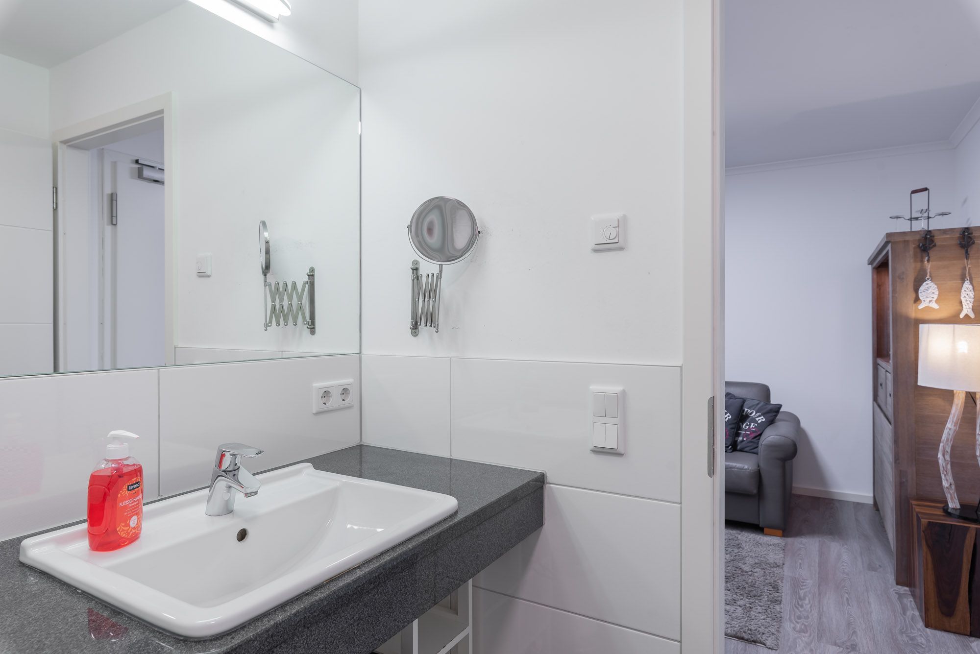 Das Badezimmer ist mit einer bodengleichen Dusche, einem großen Waschtisch, einem Wandspiegel und einem Fön ausgestattet.