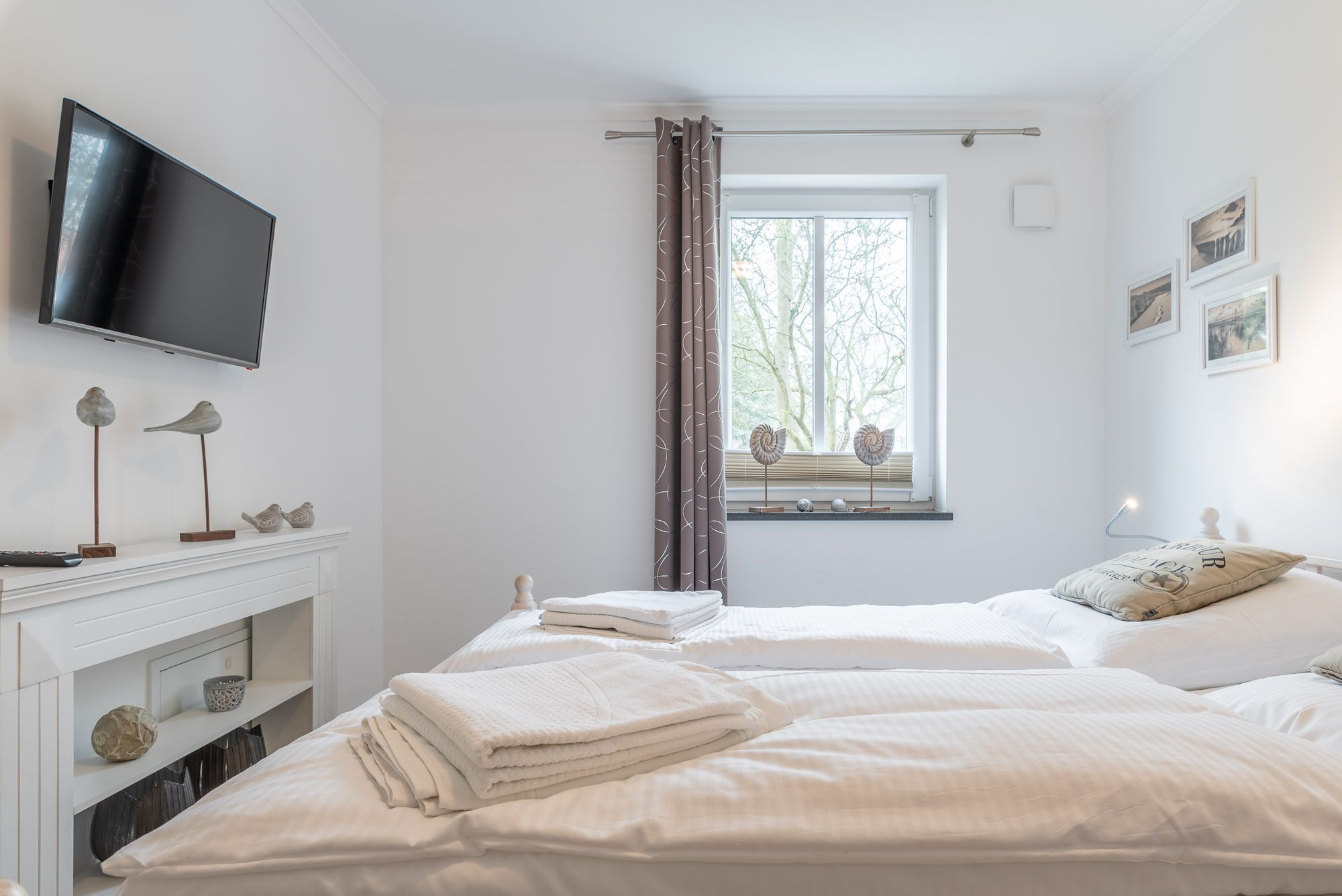 Im freundlichen Schlafzimmer finden Sie neben einem weiteren LED-TV ein komfortables Doppelbett (1,80 m) und einen geräumigen Kleiderschrank vor.