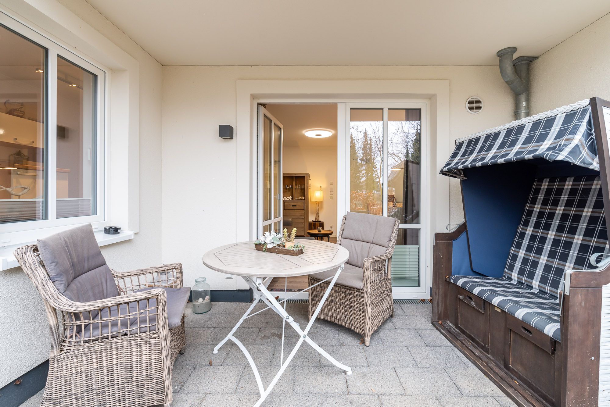 Auf der mit einem Tisch, 2 Rattan Sesseln und einem Strandkorb möblierten Terrasse (nordöstliche Ausrichtung) lassen sich gemütliche Sonnen- und Abendstunden verbringen.