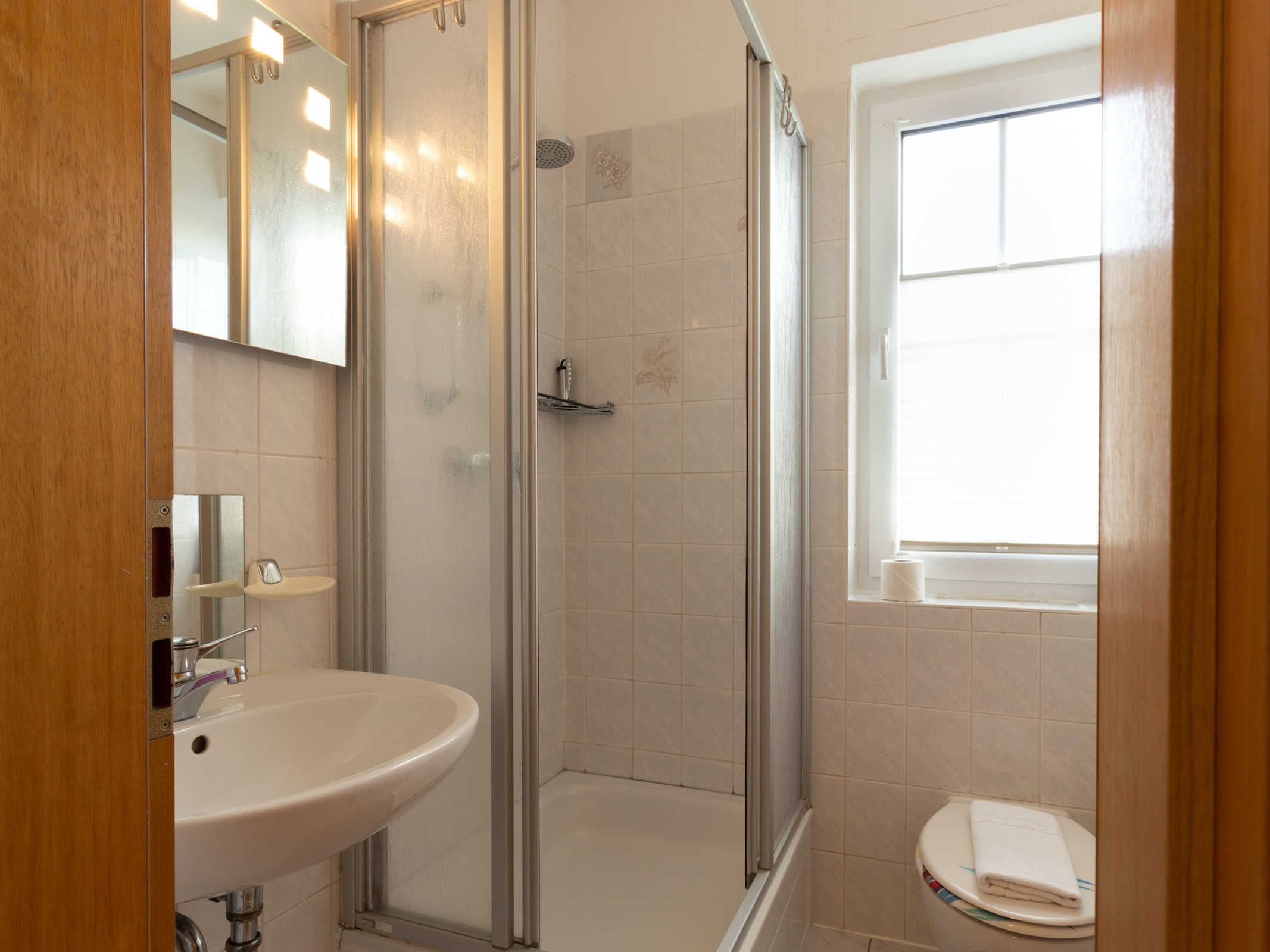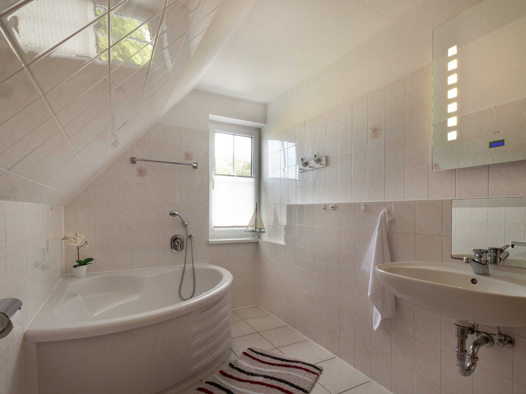 Oben stehen drei separate Schlafzimmer sowie ein Badezimmer mit Badewanne und WC zur Verfügung.