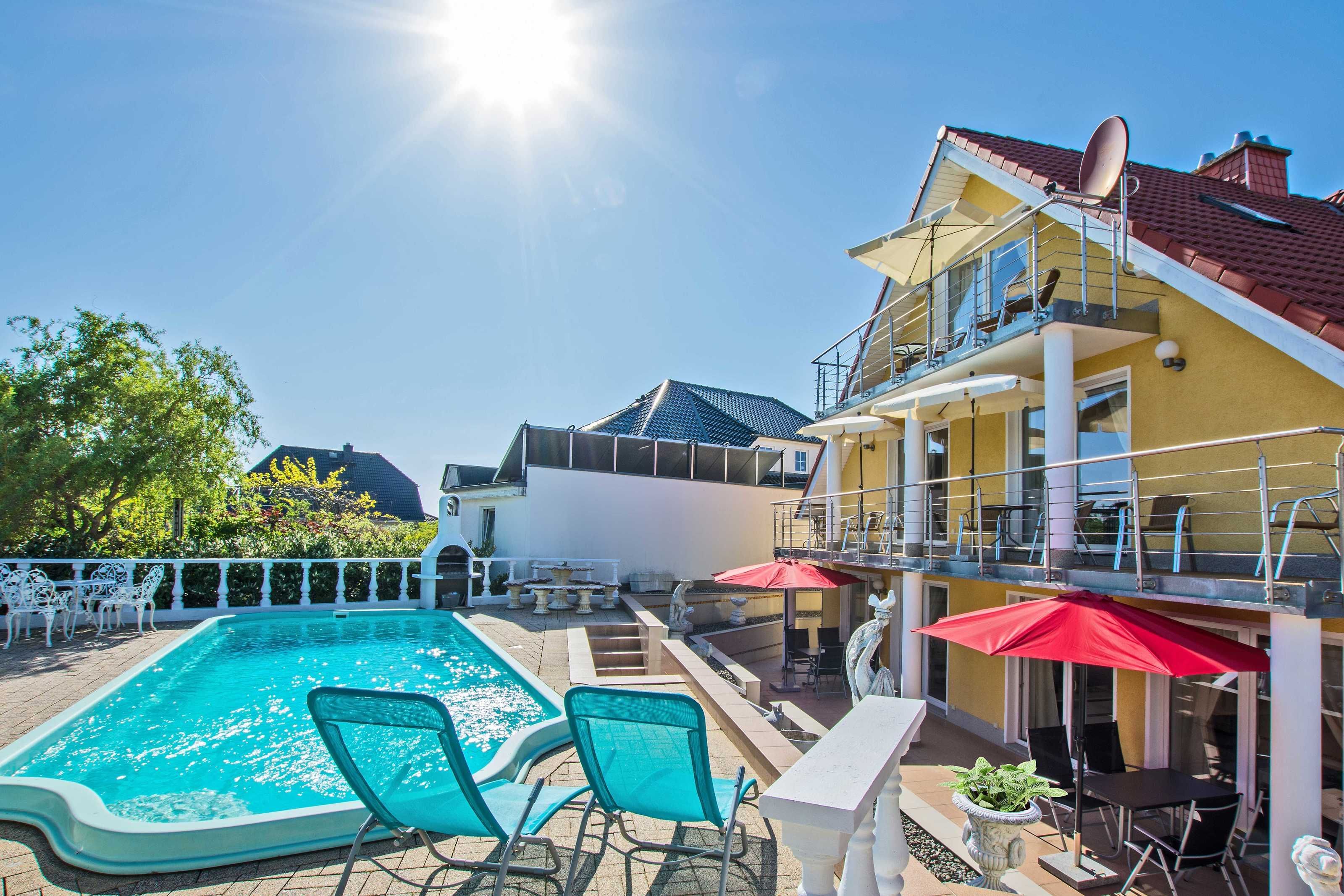 An der Seite der Villa Europa vorbei über die Terrasse gelangen Sie direkt zum sonnenbeheizten gemeinschaftlichen Außenpool, zum Grillplatz, zu den Sonnenliegen sowie zu dem XXL-Strandkorb.