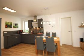 Im großzügigen Wohnbereich mit moderner offener Küche befinden sich bequeme Ledersitzmöbel, ein ausziehbarer Esstisch mit vier Stühlen , zur Unterhaltung stehen ein Flatscreen-LED-TV, ein WLAN-fähiger Blu-ray-Player sowie eine kleine HIFI-Stereoanlage zur Verfügung.