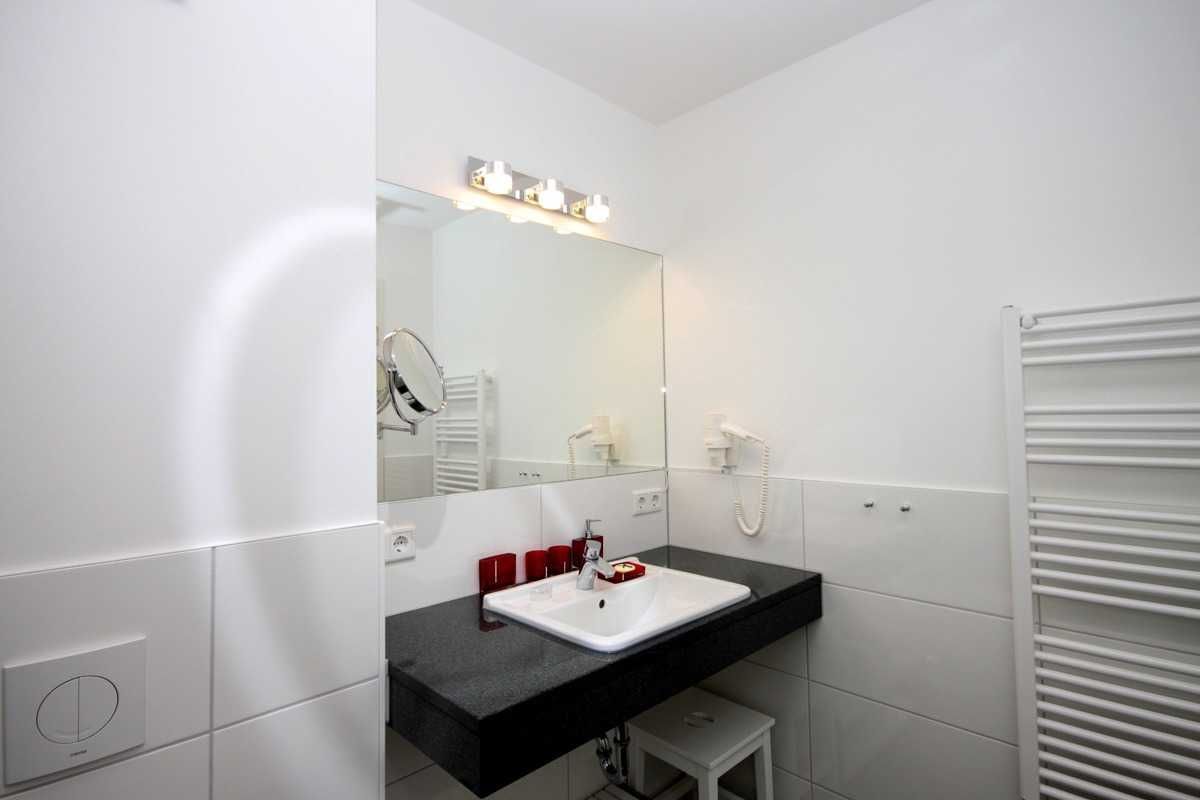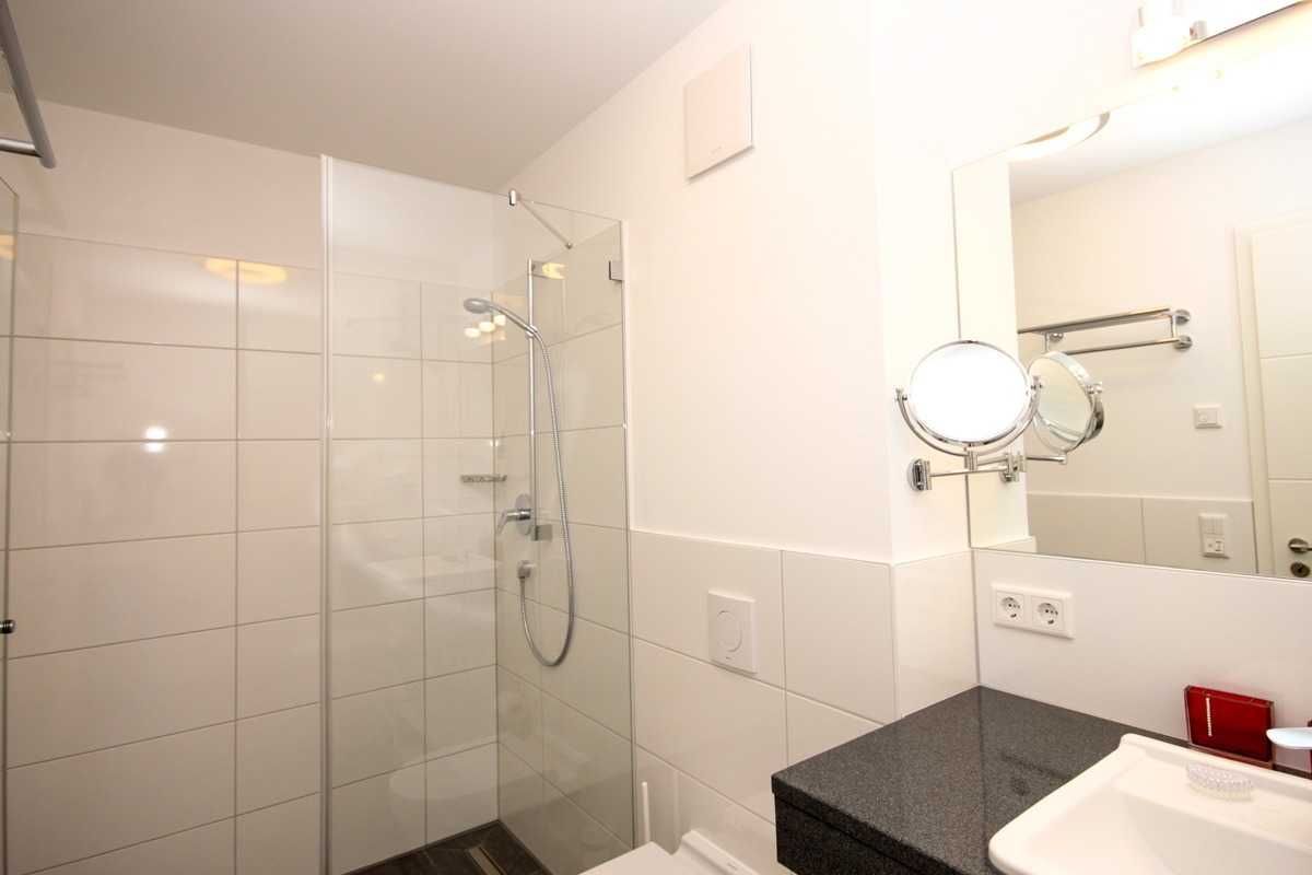 Das Badezimmer ist elegant gefliest mit ebenerdiger Dusche, zusätzlich sind ein elektrisch beheizbarer Handtuchhalter, ein Kosmetikspiegel und ein Haarfön vorhanden.