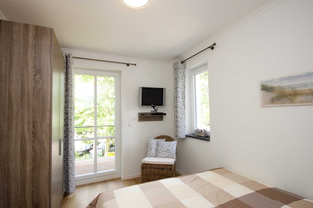 In der Wohnung befinden sich zwei Schlafzimmer (1 Boxspringbett 1,80 x 2,00 m mit durchgehender Matratze und ein bequemes Doppelbett 1,60 m x 2,0 m). Vom kleineren Schlafzimmer (hier befindet sich auch ein TV-Gerät) kann man auf einen Balkon hinaustreten, der sich unter anderem zum Trocknen der Bade- bzw. Wandersachen eignet.