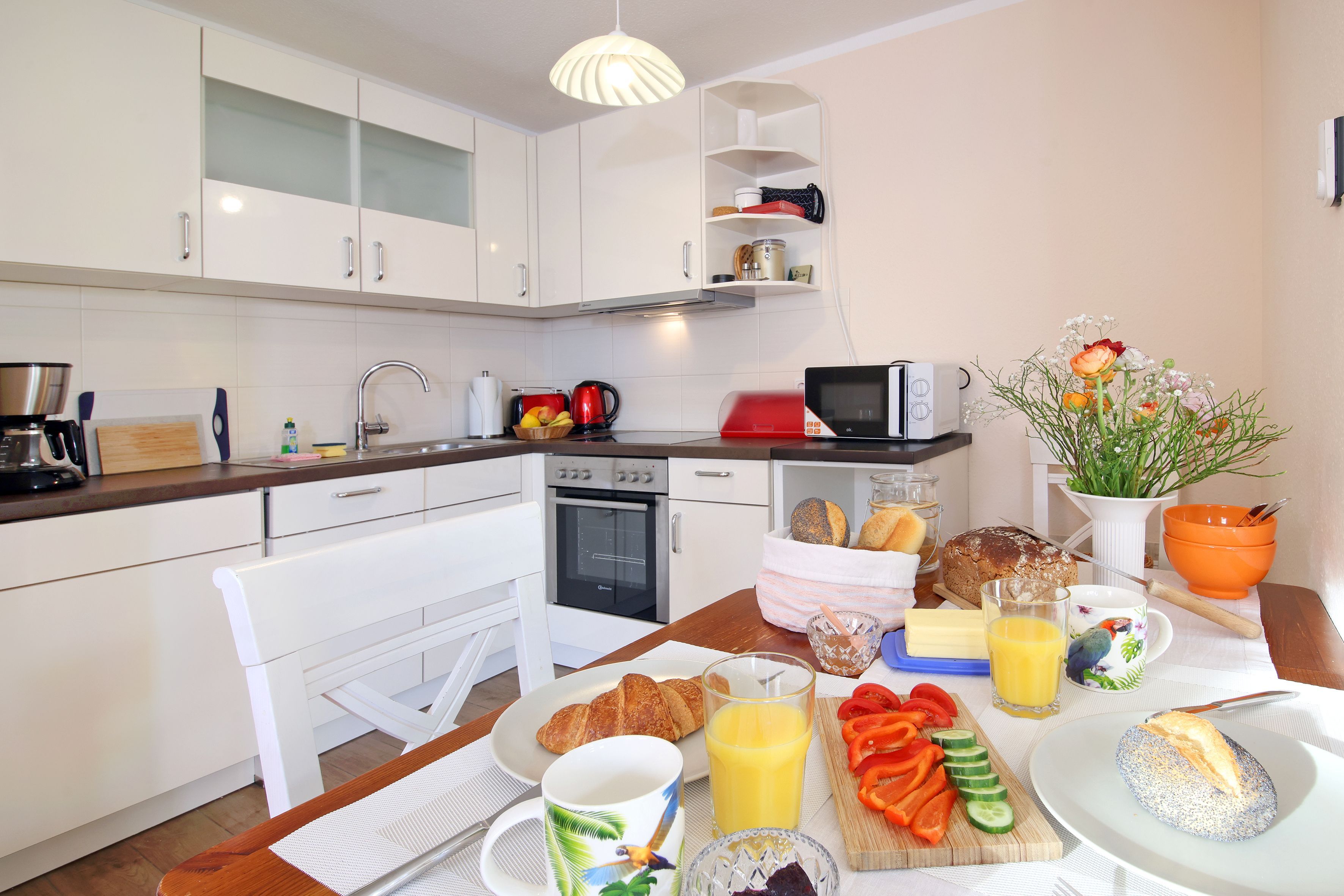 Die offene Einbauküche ist ausgestattet mit Geschirrspüler, Cerankochfeld, Backofen, Kaffeemaschine, Wasserkocher, Toaster sowie Kühlschrank mit Gefrierfach.