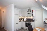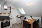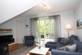 Vom Eingangsbereich gelangen Sie in den Wohnbereich mit offener Küche und dem Zugang zum Balkon mit Südausrichtung sowie zum Schlafzimmer im Türmchen. Im offenen Wohn- und Essbereich finden Sie eine gemütliche Couch zum Entspannen, eine kleine Auswahl an Büchern, einen Flat Screen-TV sowie eine DVD-Anlage, einen Esstisch mit sechs Stühlen und eine moderne Einbauküche mit Glaskeramik-Kochfeld, Backofen, Geschirrspüler, Toaster, Kaffeemaschine und Wasserkocher. Auf der mit einem Tisch und fünf Stühlen möblierten Terrasse können Sie viele gemütliche Sonnen- und ruhige Abendstunden verbringen.