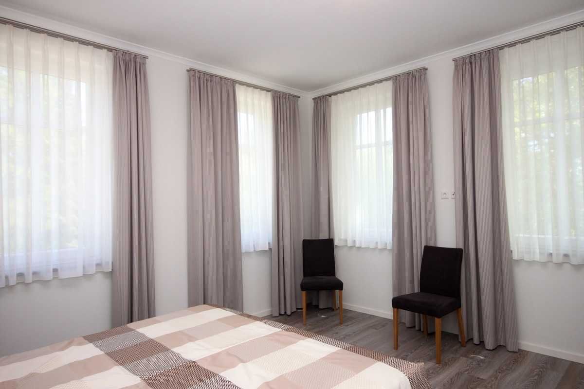 Das gemütliche Schlafzimmer im Türmchen verfügt über ein Boxspring - Doppelbett mit einer durchgehenden Matratze (180x200) und einen geräumigen Kleiderschrank.