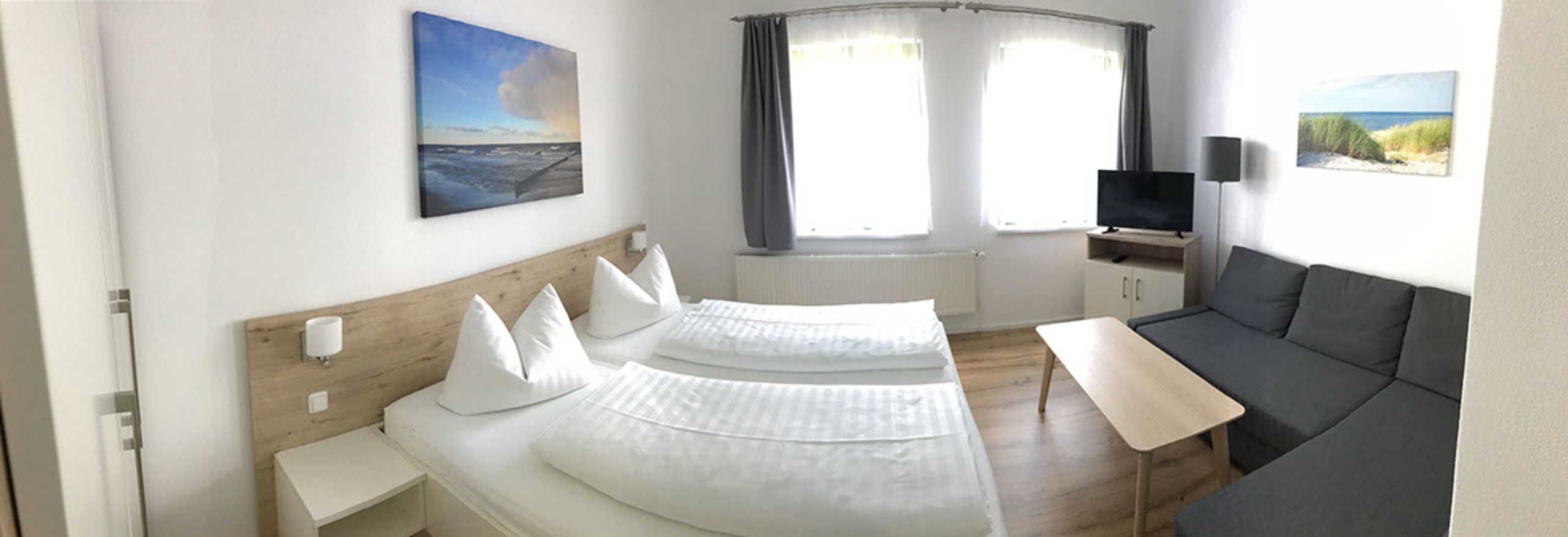 1x grosser Wohn/Schlafbereich mit grossem Doppelbett, Sofa und TV