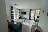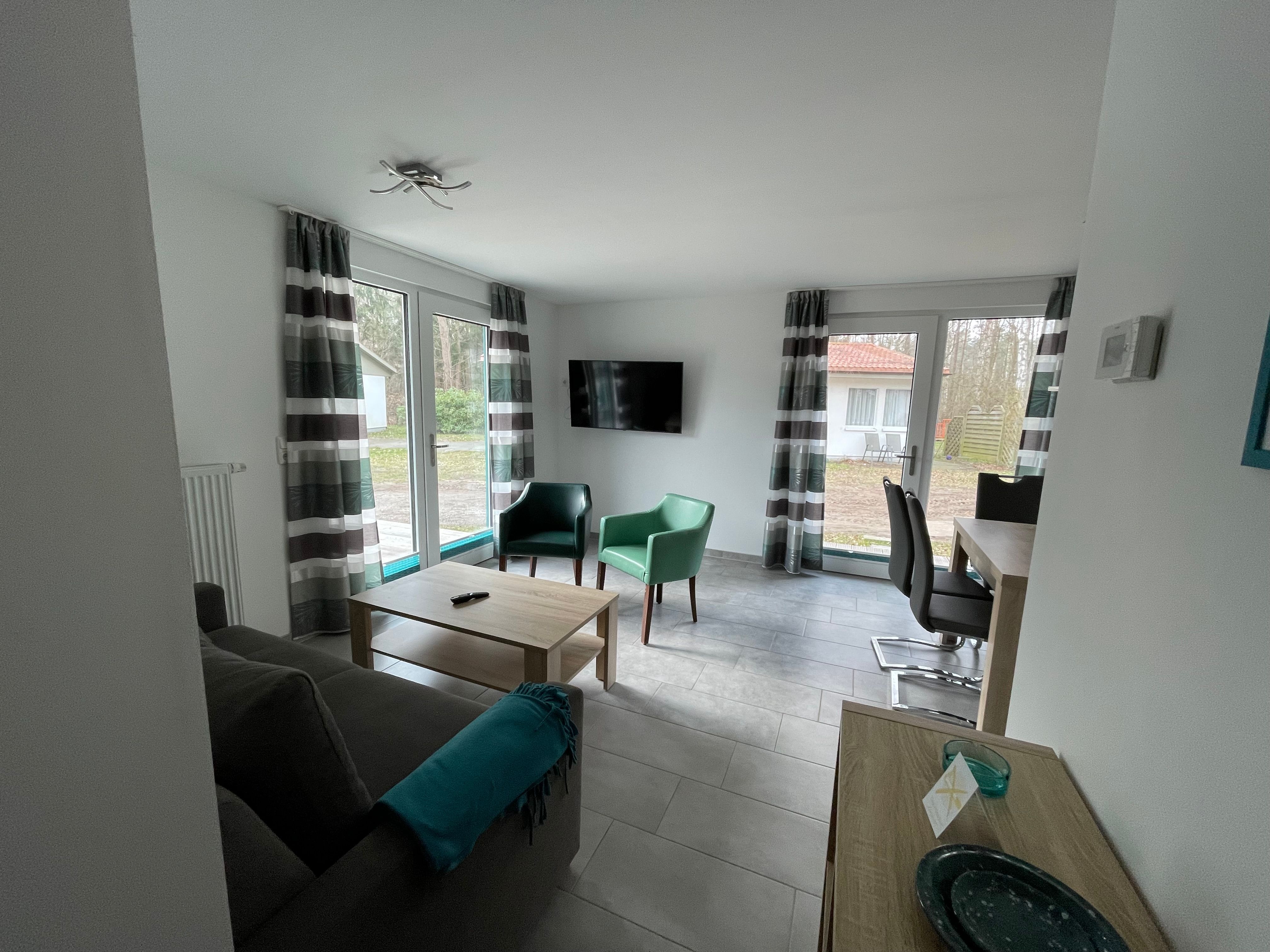 Unsere Ferienhäuser M verfügen jeweils über zwei Schlafzimmer, eins mit Doppelbett und eins mit Doppelbett und Einzelbett. Neben der gemütlichen Schlafcouch im Wohnbereich gibt es zudem noch einen Esstisch sowie eine komplett ausgestattete Küchenzeile. Ein eigenes Badezimmer mit Dusche und WC runden die Ausstattung unserer Ferienhäuser M ab.