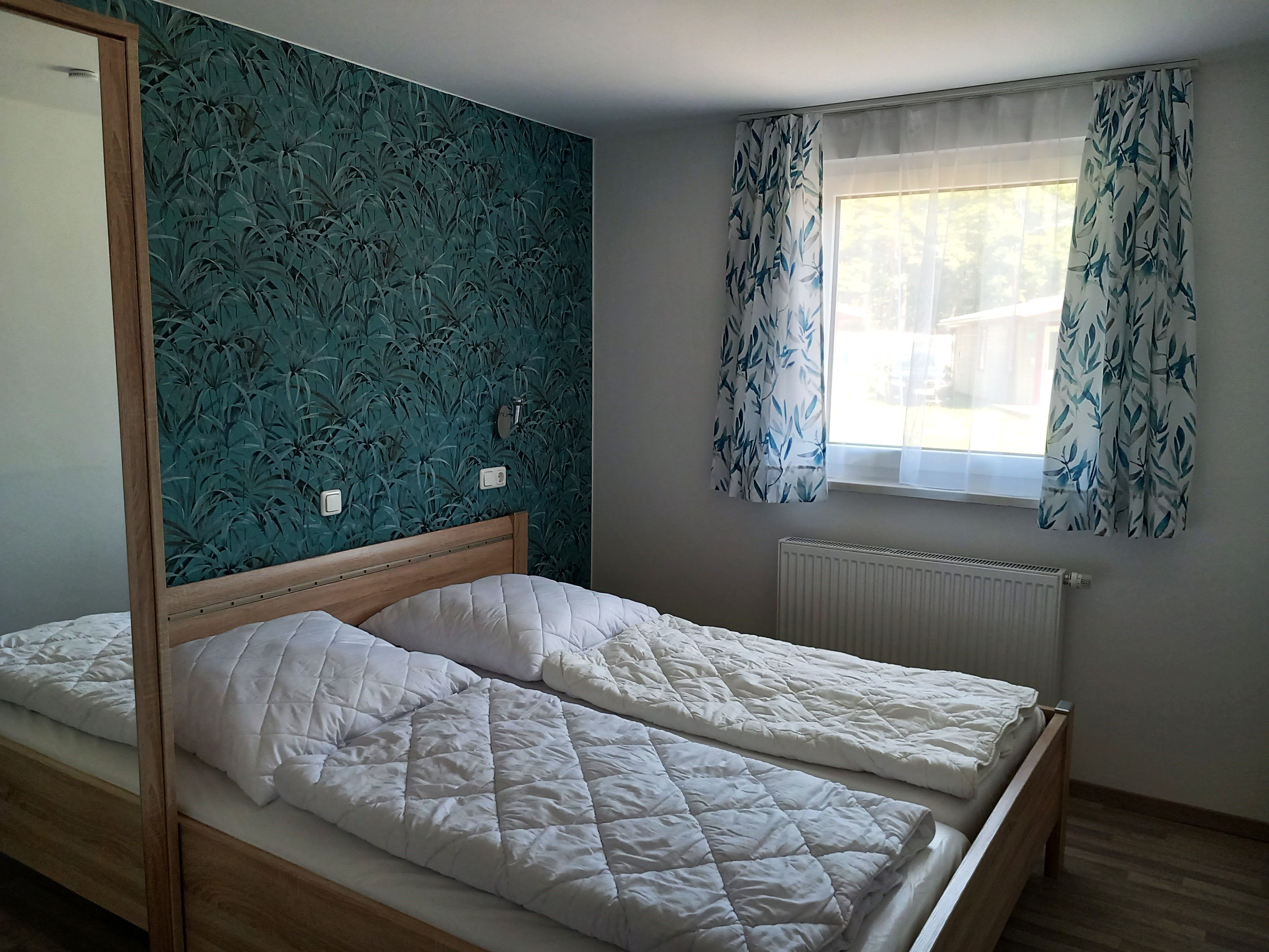 Unsere Ferienhäuser M verfügen jeweils über zwei Schlafzimmer, eins mit Doppelbett und eins mit Doppelbett und Einzelbett. Neben der gemütlichen Schlafcouch im Wohnbereich gibt es zudem noch einen Esstisch sowie eine komplett ausgestattete Küchenzeile. Ein eigenes Badezimmer mit Dusche und WC runden die Ausstattung unserer Ferienhäuser M ab.