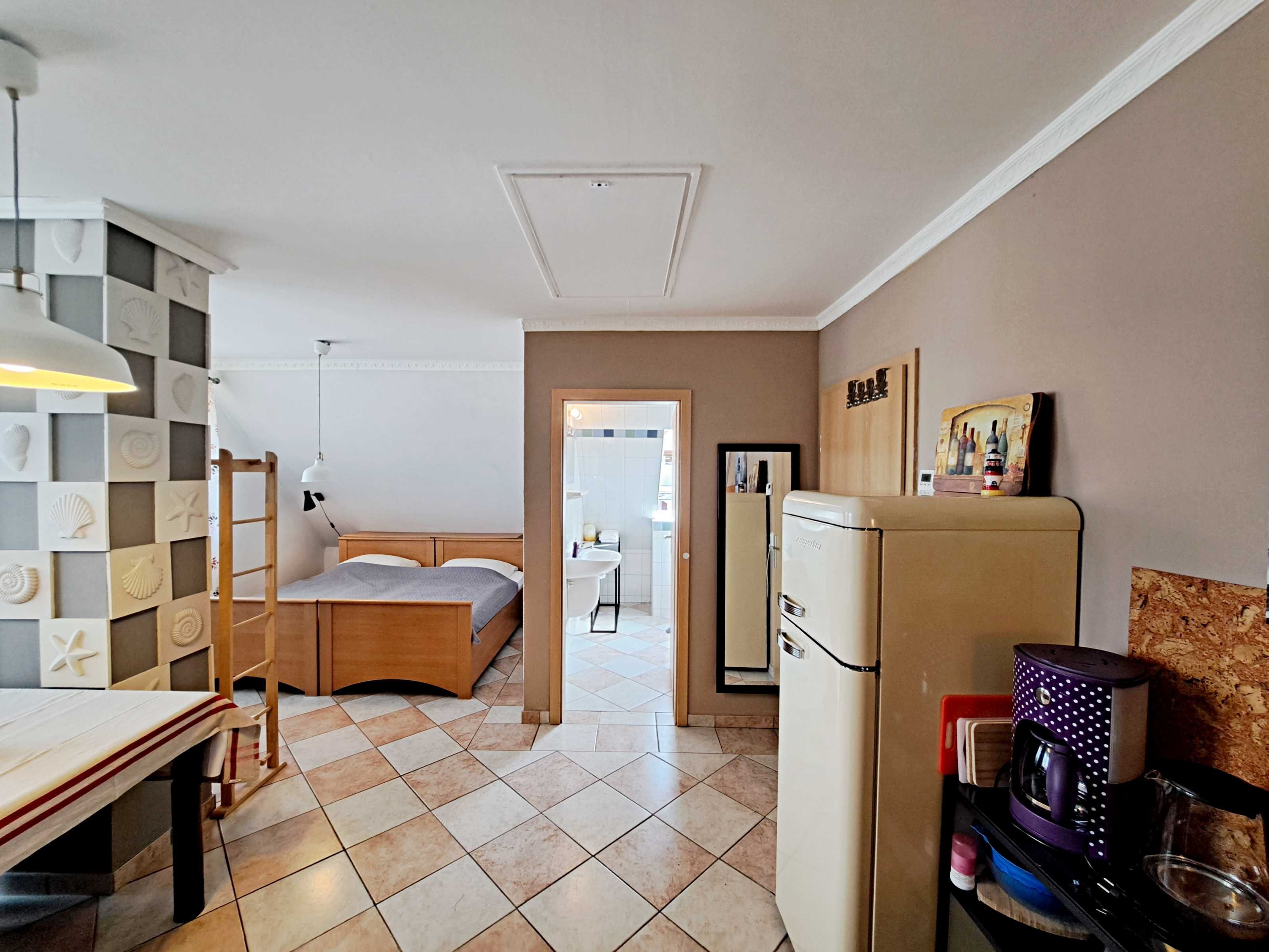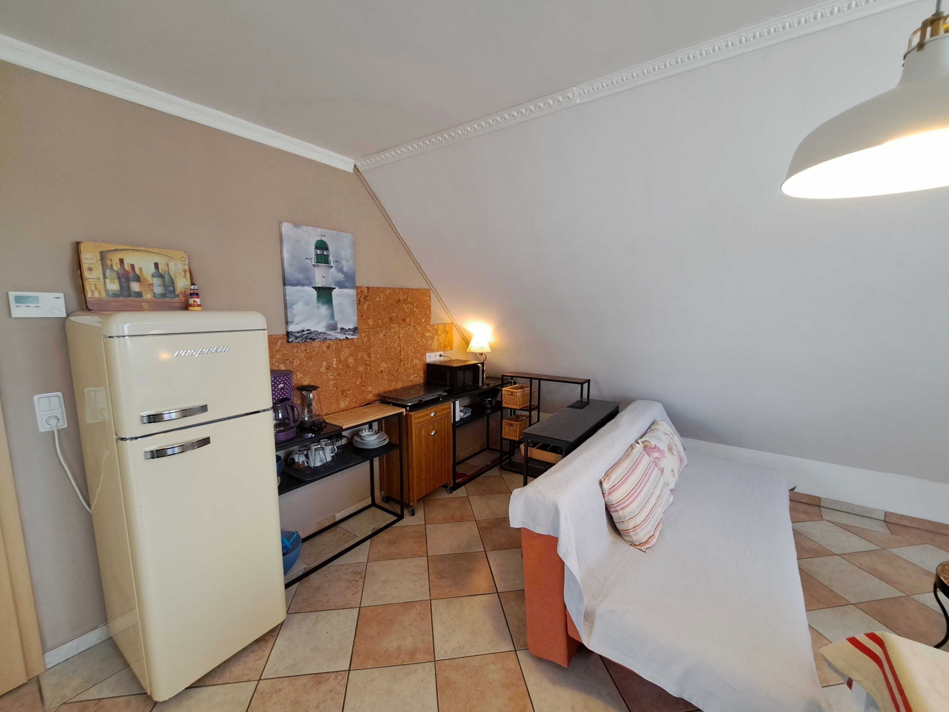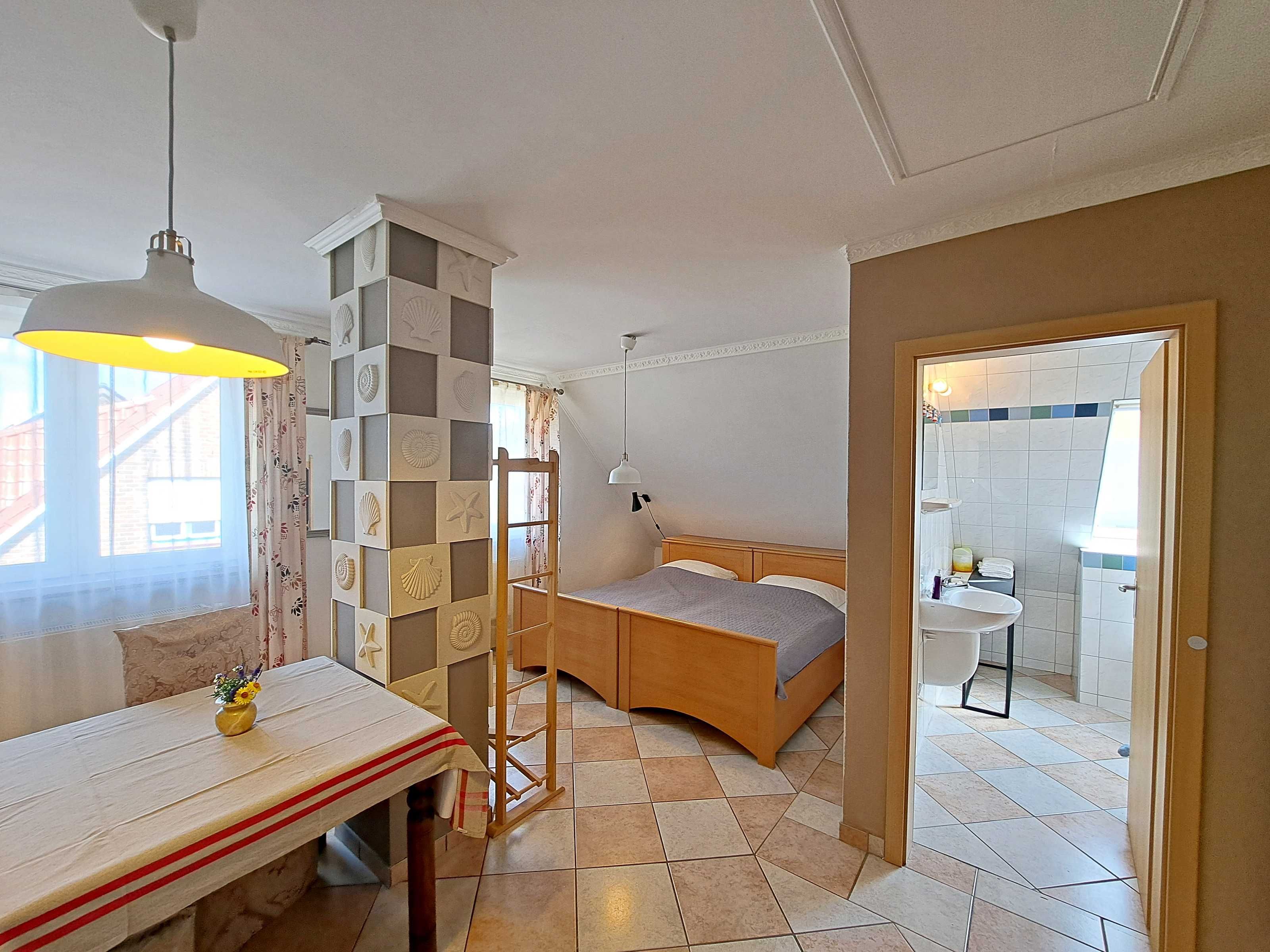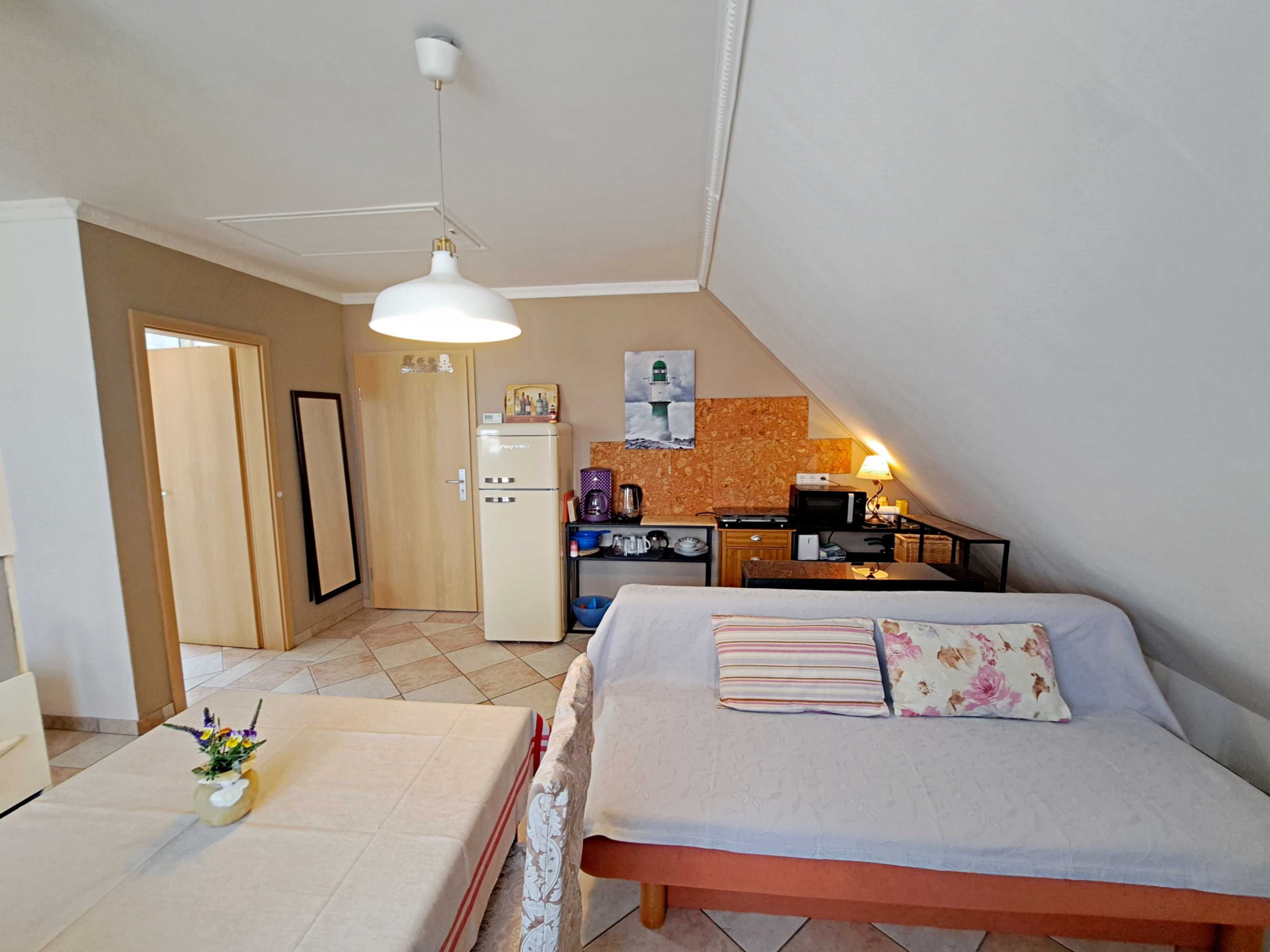 Mit einer Fläche von 29 qm im 1. Obergeschoss eines Einfamilienhauses bietet dieses gemütliche 1-Raum-Appartement ausreichend Platz für zwei Personen um einen entspannten Aufenthalt zu genießen. Der kombinierte Wohn- und Schlafbereich ist liebevoll eingerichtet und verfügt über eine bequeme Couch, einen Flat-TV und ein Radio, sowie ein einladendes Doppelbett für erholsame Nächte. In der kleinen, aber feinen Küchenzeile finden Sie alles, was Sie für die Zubereitung Ihrer Mahlzeiten benötigen: einen Zwei-Platten-Herd, einen Kühlschrank mit Gefriermöglichkeit, einen Wasserkocher, eine Kaffeemaschine und eine Mikrowelle. Bitte beachten Sie, dass es keine Spüle gibt, aber Geschirr ist selbstverständlich vorhanden. Das Tageslicht-Bad ist mit einer Dusche und WC ausgestattet und sorgt für zusätzlichen Komfort. Die Erstausstattung Bettwäsche und Handtüchern ist bereits inklusive, sodass Sie sich um nichts kümmern müssen. Leider können wir keine Haustiere aufnehmen, aber Kinder ab einem Alter von 5 Jahren sind herzlich willkommen! Ein Parkplatz direkt am Haus steht Ihnen kostenfrei zur Verfügung, ebenso wie WLAN, damit Sie auch während Ihres Aufenthalts in Verbindung bleiben können. Ihre eigenen Fahrräder können Sie gerne bei uns unterstellen.