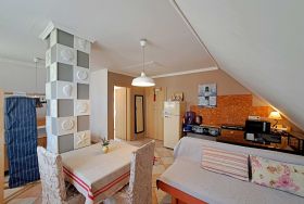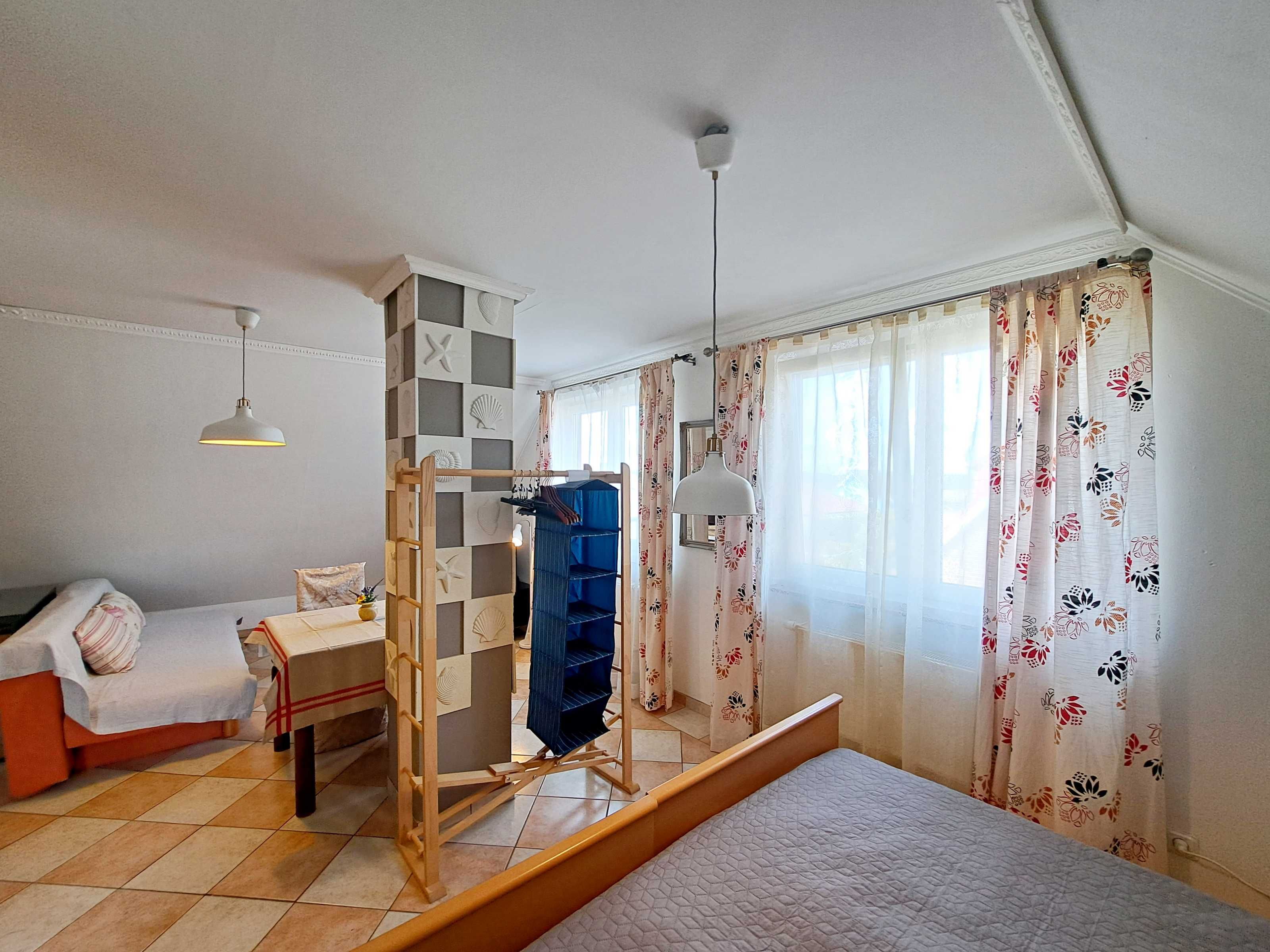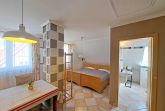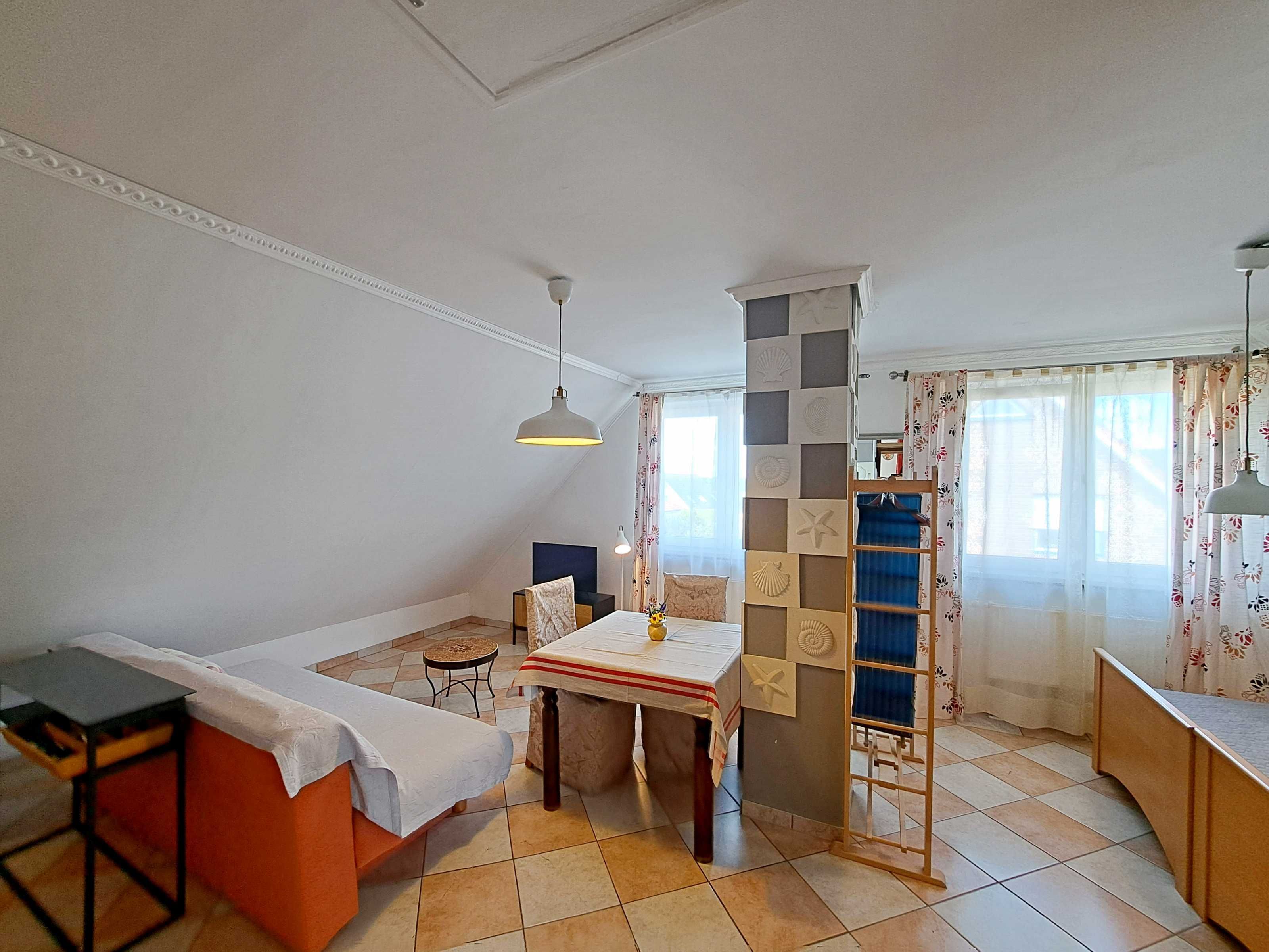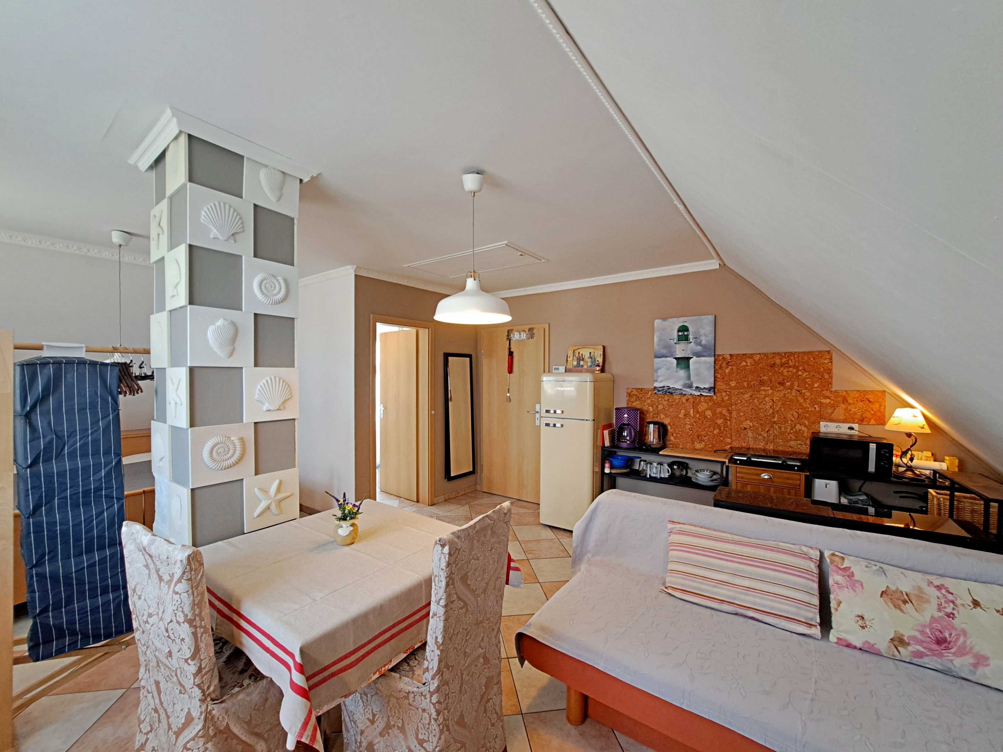 Mit einer Fläche von 29 qm im 1. Obergeschoss eines Einfamilienhauses bietet dieses gemütliche 1-Raum-Appartement ausreichend Platz für zwei Personen um einen entspannten Aufenthalt zu genießen. Der kombinierte Wohn- und Schlafbereich ist liebevoll eingerichtet und verfügt über eine bequeme Couch, einen Flat-TV und ein Radio, sowie ein einladendes Doppelbett für erholsame Nächte. In der kleinen, aber feinen Küchenzeile finden Sie alles, was Sie für die Zubereitung Ihrer Mahlzeiten benötigen: einen Zwei-Platten-Herd, einen Kühlschrank mit Gefriermöglichkeit, einen Wasserkocher, eine Kaffeemaschine und eine Mikrowelle. Bitte beachten Sie, dass es keine Spüle gibt, aber Geschirr ist selbstverständlich vorhanden. Das Tageslicht-Bad ist mit einer Dusche und WC ausgestattet und sorgt für zusätzlichen Komfort. Die Erstausstattung Bettwäsche und Handtüchern ist bereits inklusive, sodass Sie sich um nichts kümmern müssen. Leider können wir keine Haustiere aufnehmen, aber Kinder ab einem Alter von 5 Jahren sind herzlich willkommen! Ein Parkplatz direkt am Haus steht Ihnen kostenfrei zur Verfügung, ebenso wie WLAN, damit Sie auch während Ihres Aufenthalts in Verbindung bleiben können. Ihre eigenen Fahrräder können Sie gerne bei uns unterstellen.