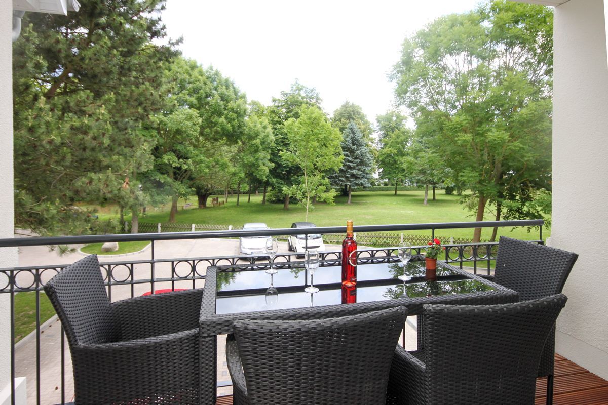 Balkon mit Bistrotisch und 4 Stapelsessel