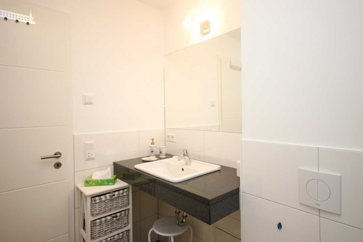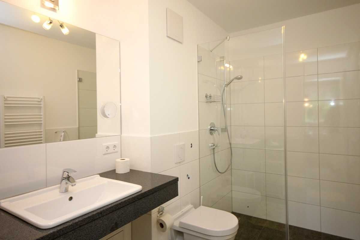 Hochwertiges Bad mit ebenerdiger Regenwalddusche, Fön, Elektrohandtuchhalter;