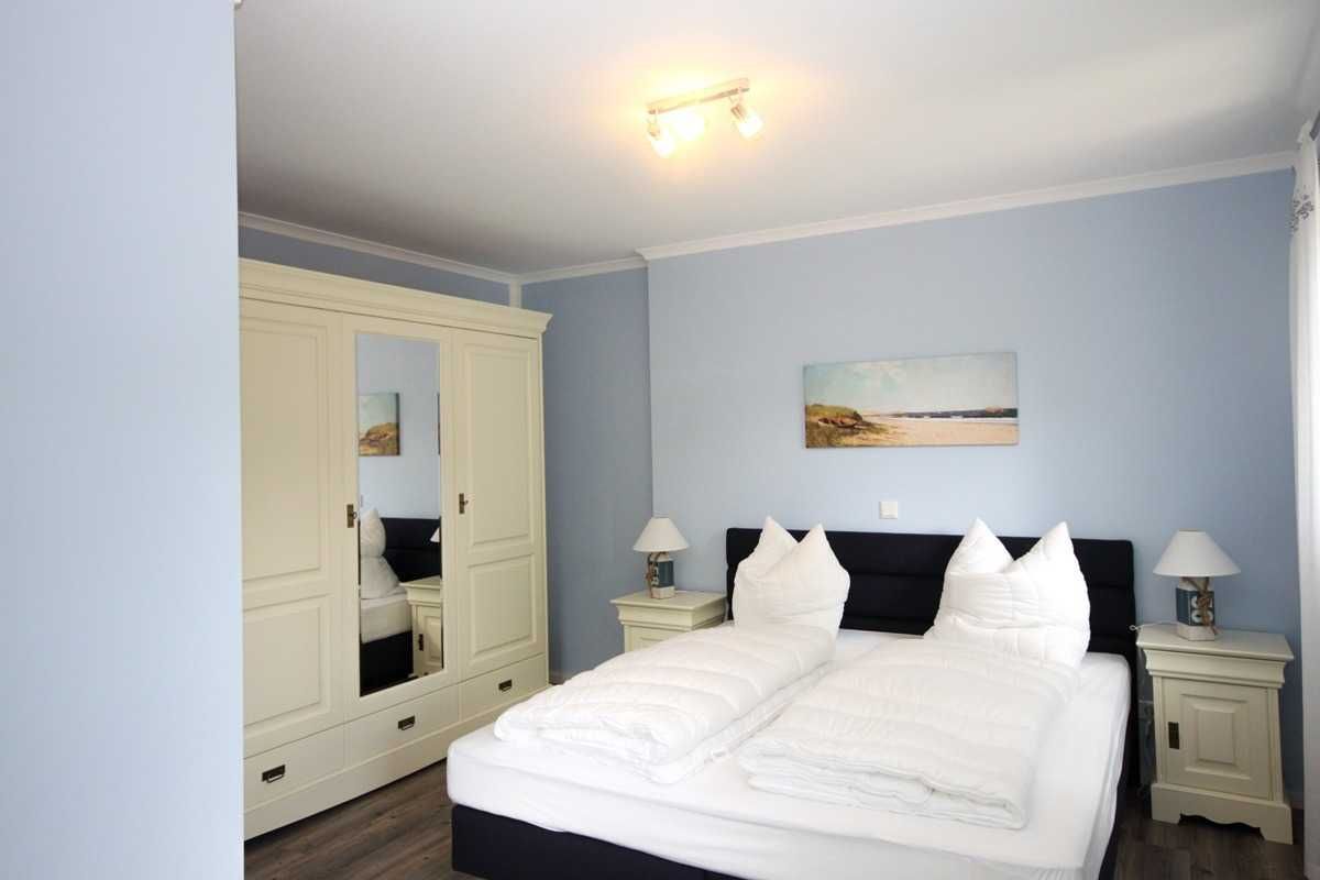 Schlafzimmer mit großem Boxspringbett, Kleiderschrank, Nachtkonsolen und Truhe;