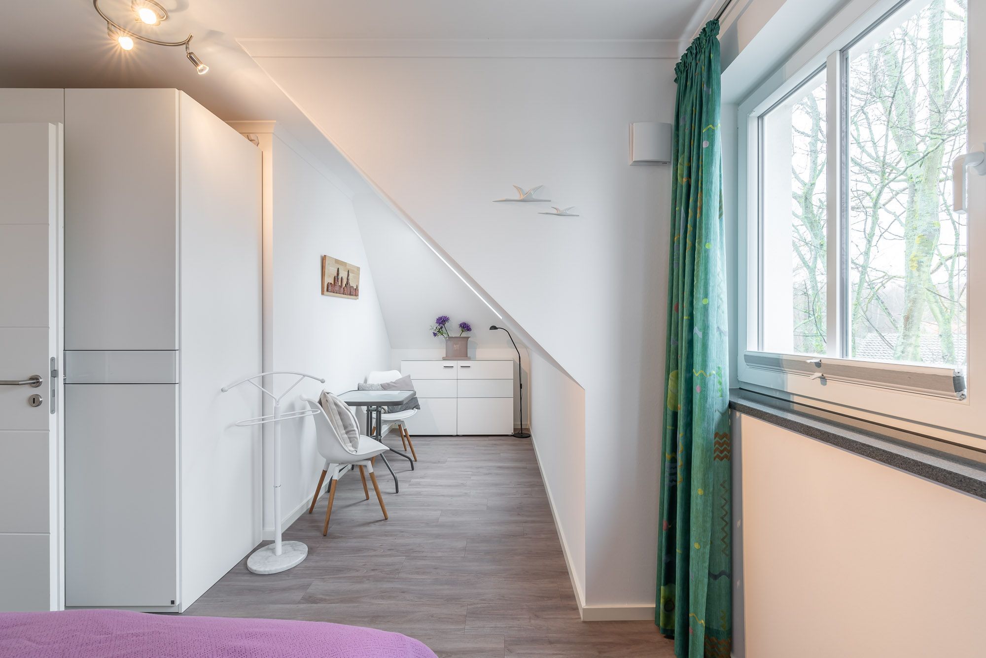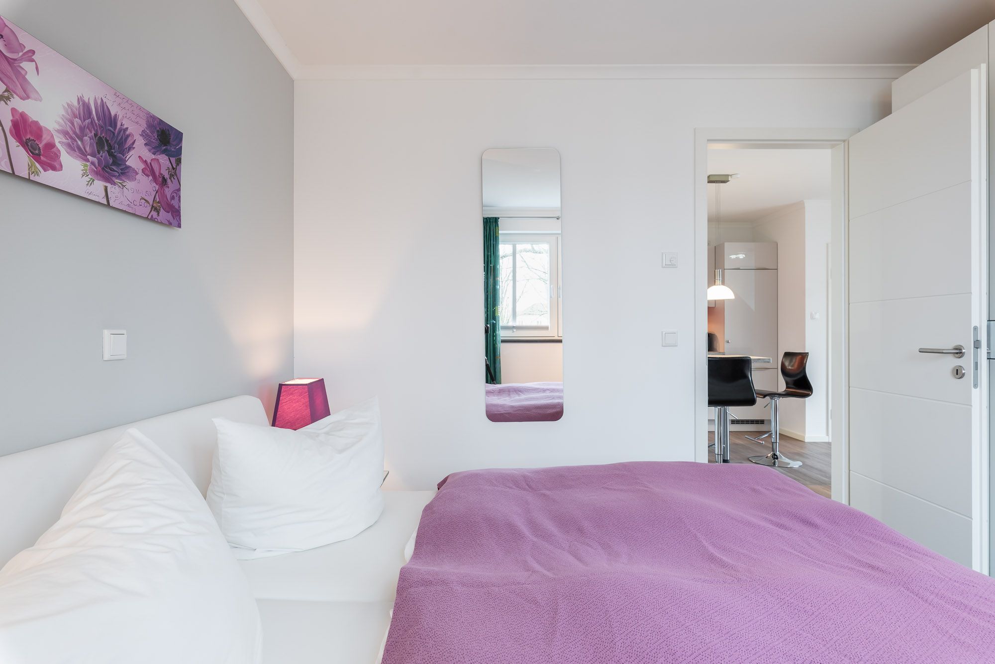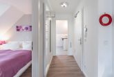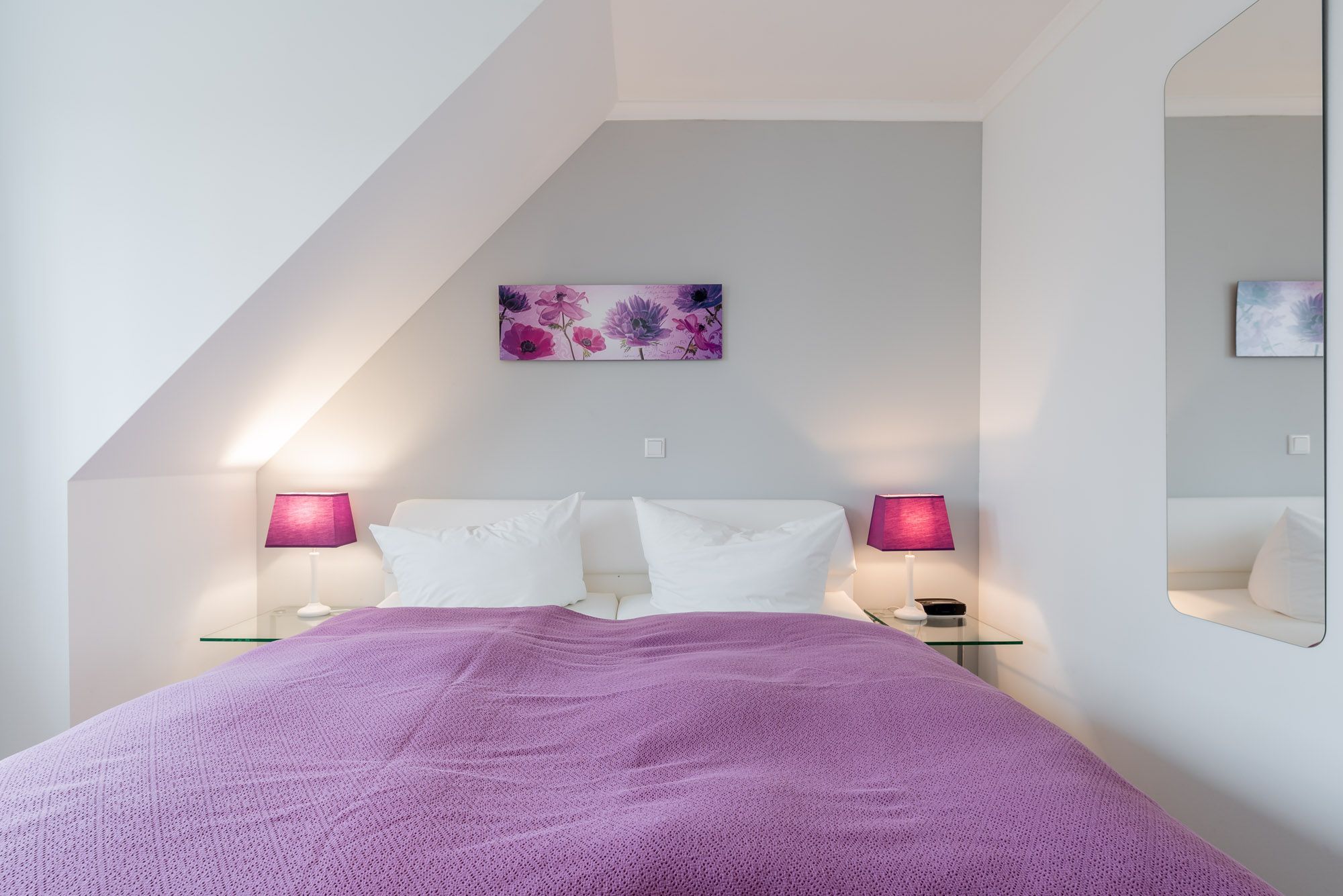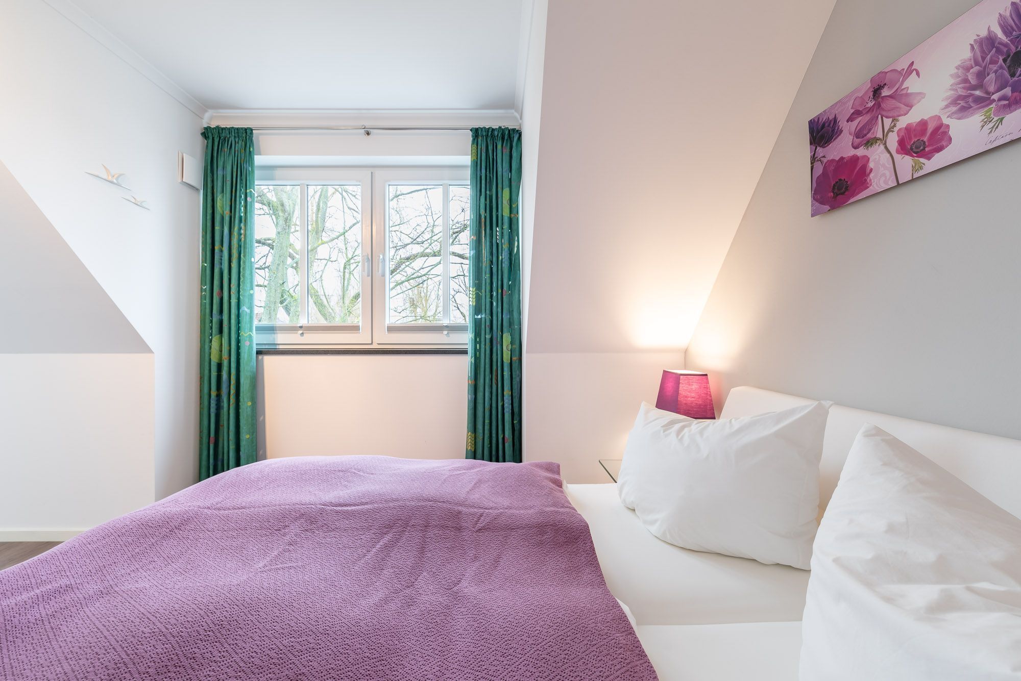 Das hochwertig ausgestattete Schlafzimmer mit Doppelbett, manuell verstellbarem Kopf- und Fußteil, Tonnentaschenfederkernmatratzen, sowie einem Kleiderschrank und Kommode liegt nach Norden.