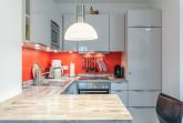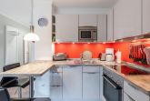 Die in den Wohnbereich integrierte Siemens Eck-Küche ist mit Mikrowelle, Edelstahlherd mit Glaskeramik-Kochfeld und Backofen, Kombi-Kühlschrank, Geschirrspüler, Toaster, Kaffeemaschine, Nespresso-Kapselmaschine, Wasserkocher, sowie einem Essplatz für 2 Personen ausgestattet.
