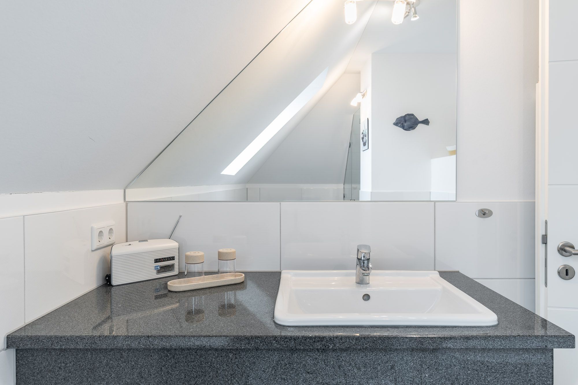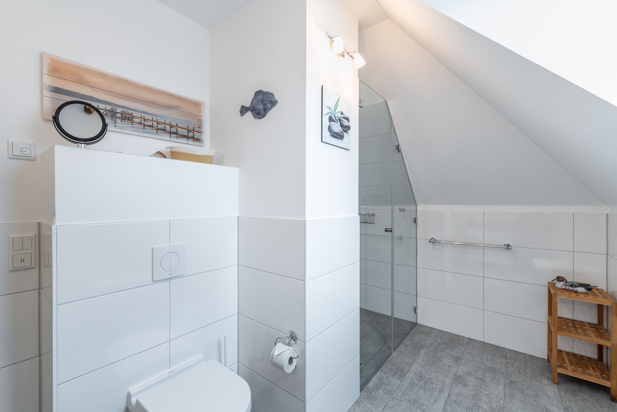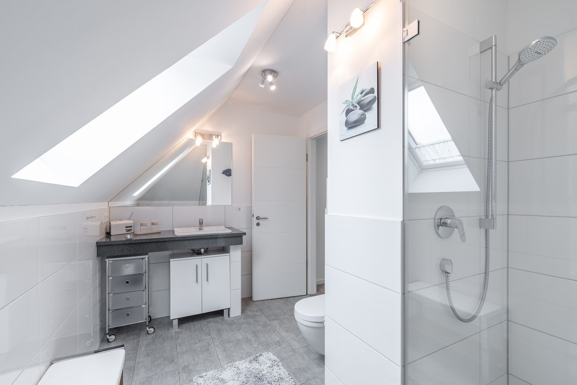 Das Bad mit Tageslicht verfügt über eine großzügige und ebenerdige Dusche, ein Fön ist vorhanden.
