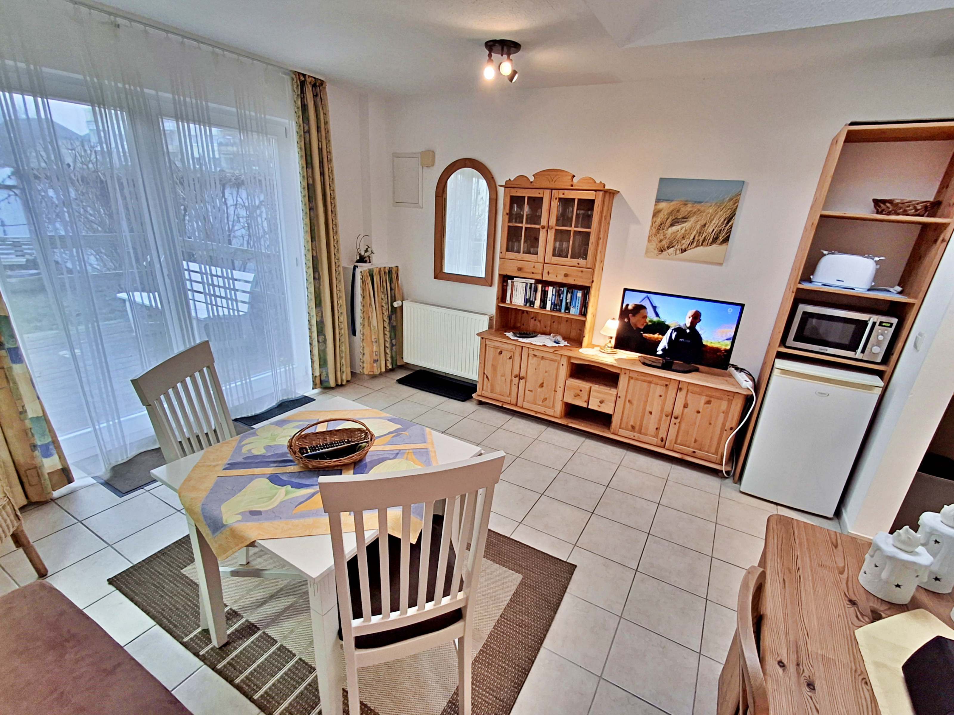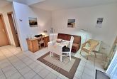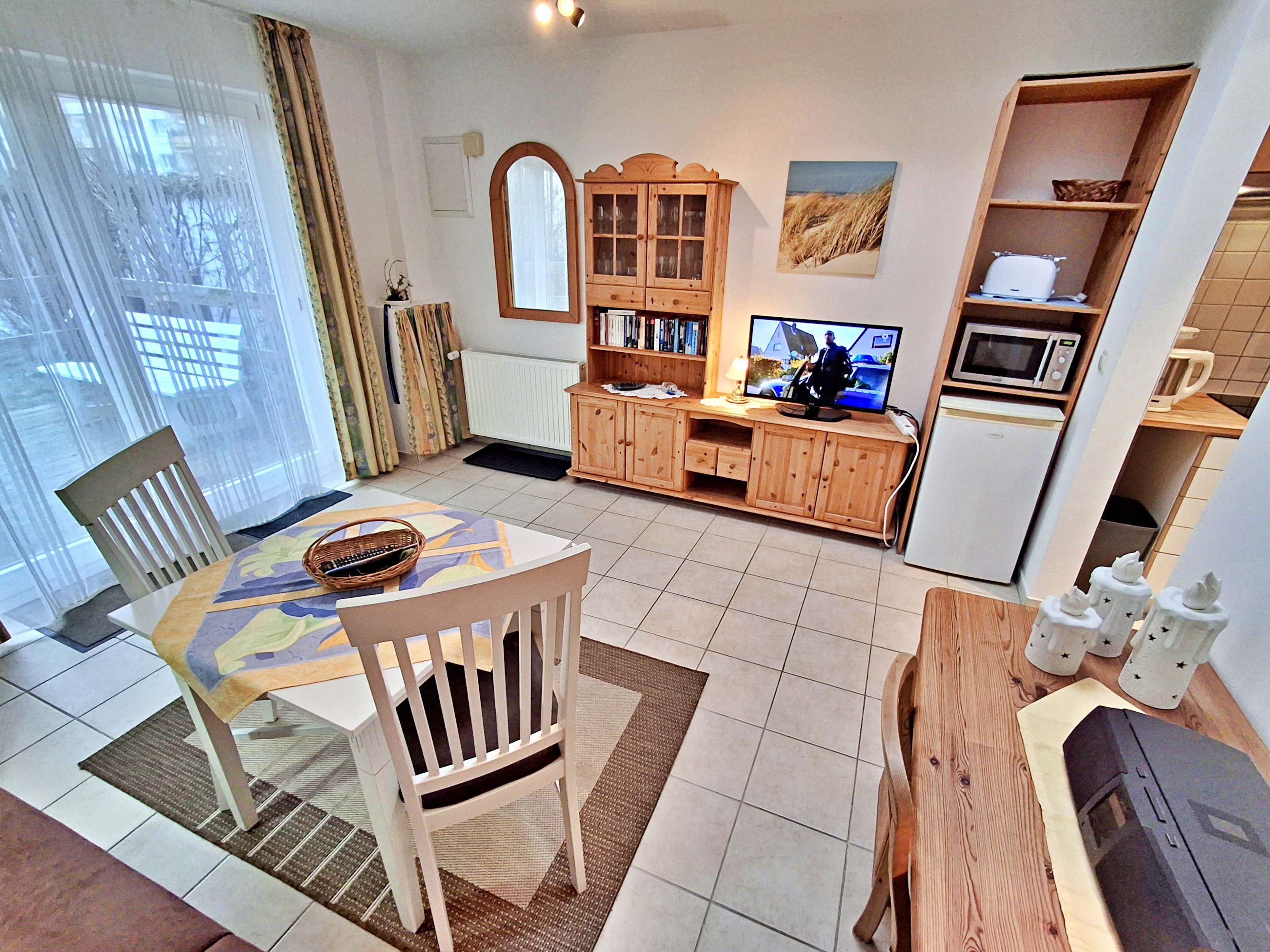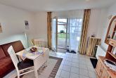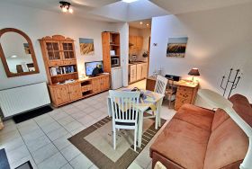 Diese helle und freundliche 40qm große 2-Raum-Ferienwohnung im Erdgeschoss verfügt über einen kombinierten Wohn- und Schlafraum (Schlafcouch für max. 1 Kind bis acht Jahre) mit Kabel-TV und Radio sowie ein Schlafzimmer mit einem Doppelbett. Die Küchenzeile ist mit 2-Felder-Ceran-Herd, Kühlschrank, Mikrowelle, Kaffeemaschine, Toaster und Geschirr ausgestattet. Das Badezimmer hat Dusche und WC. Die Terrasse mit Sitzmöbeln lädt zum Verweilen ein und vervollständigt die Ausstattung der Wohnung. Ihren Pkw können Sie gern an der Ferienwohnung parken (nicht für Kleinbusse und Anhänger geeignet).