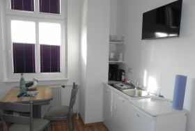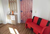 Die ca. 23 qm große neu renovierte 1 Raum Ferienwohnung befindet sich im Obergeschoss und ist ideal für 2 Personen geeignet. Der Schlafbereich mit Doppelbett und Kleiderschrank befindet sich in dem offenen Wohnraum, optisch von der Sitzecke getrennt. Innerhalb der Ferienwohnung befindet sich eine kleine Küchzeile ohne Kochmöglichkeit. Diese verfügt über ein Kühlschrank, Spüle, Wasserkocher, Toster und Geschirr. Das große Bad mit Fenster verfügt über eine große Dusche und WC. Die Erstausstattung Bettwäsche und Handtücher ist im Preis enthalten.
