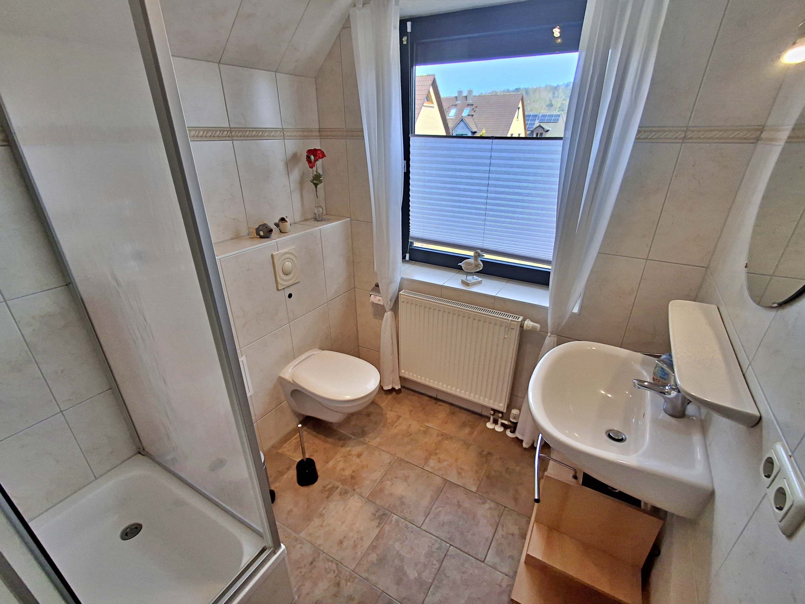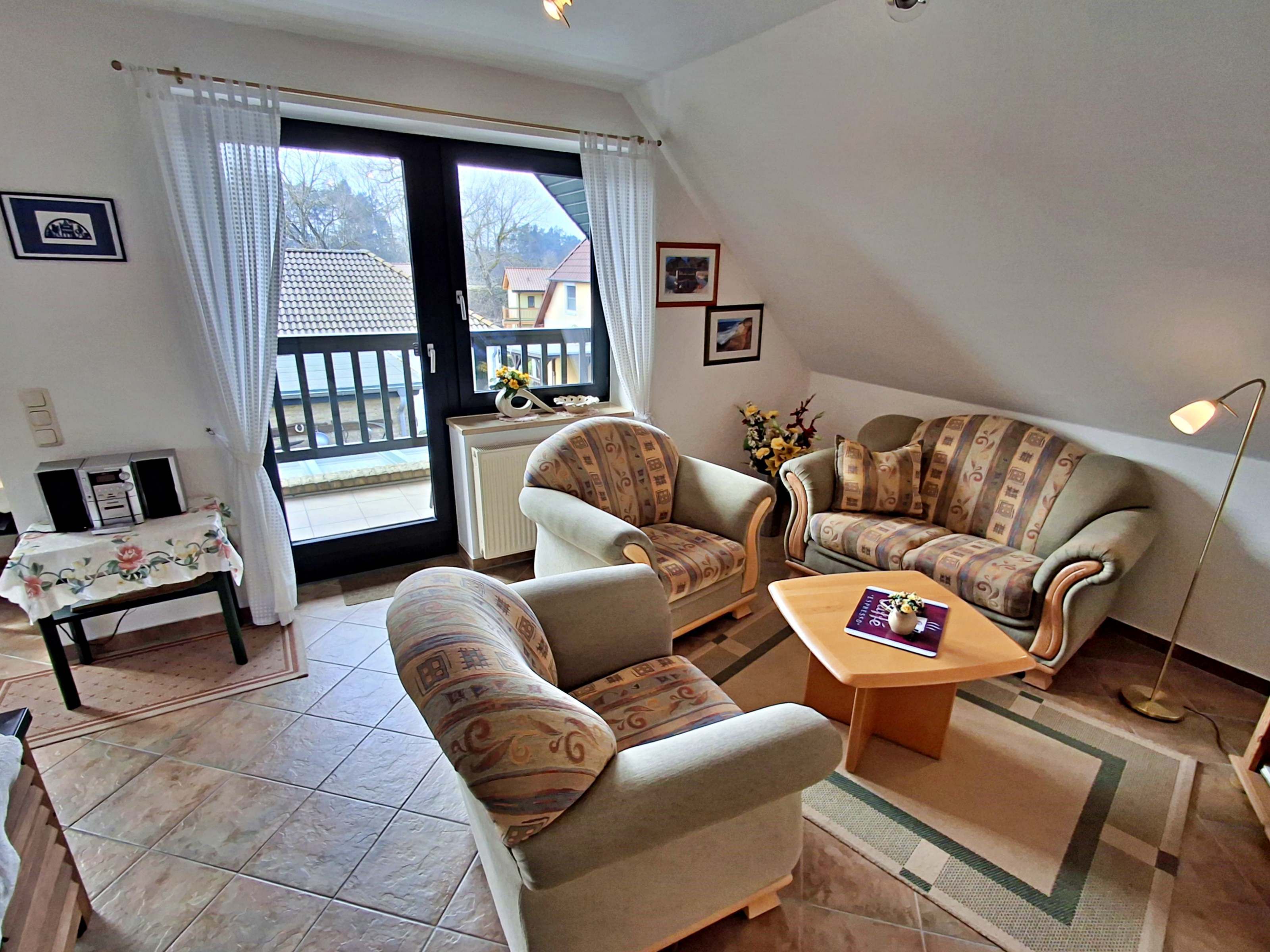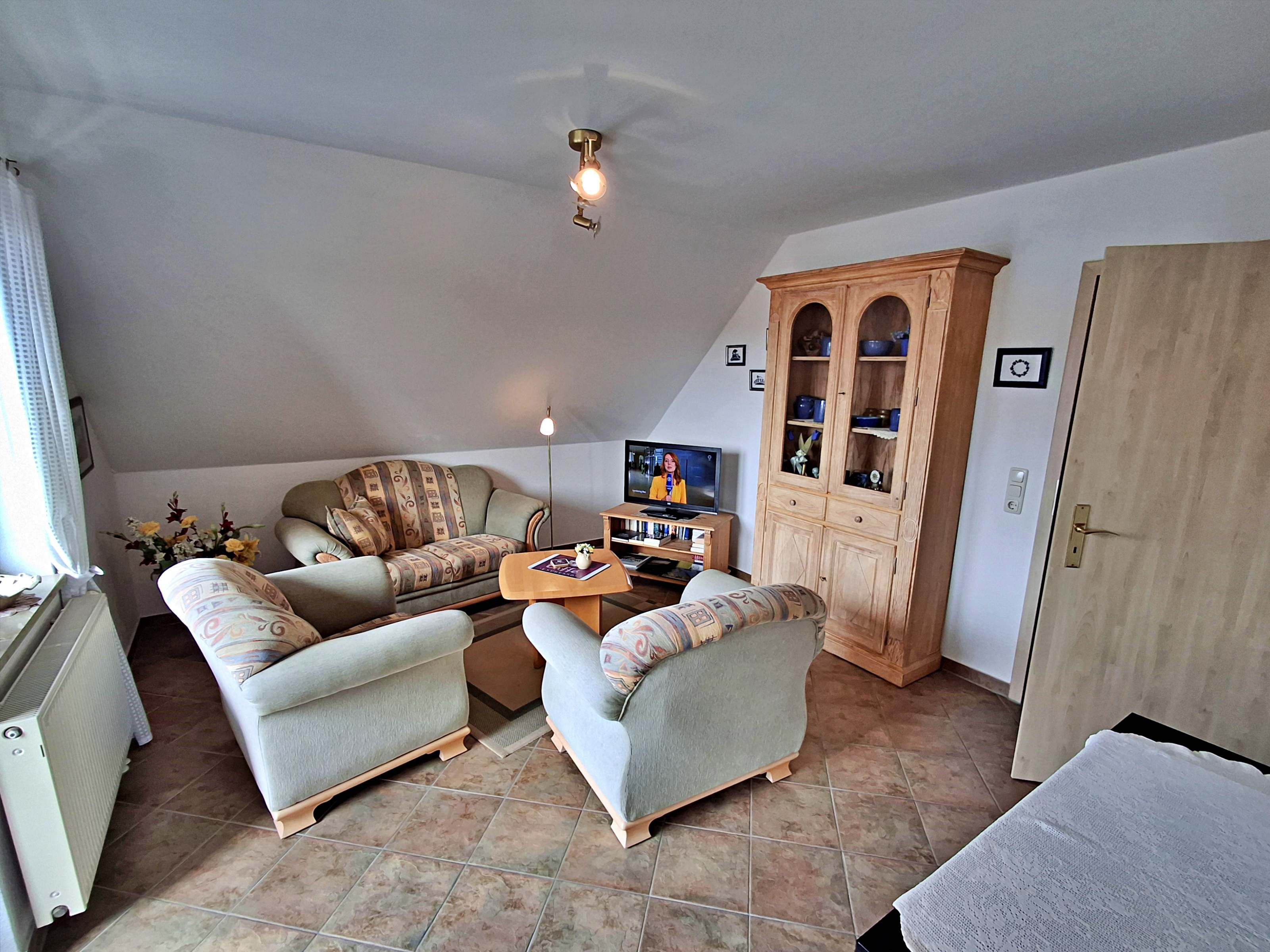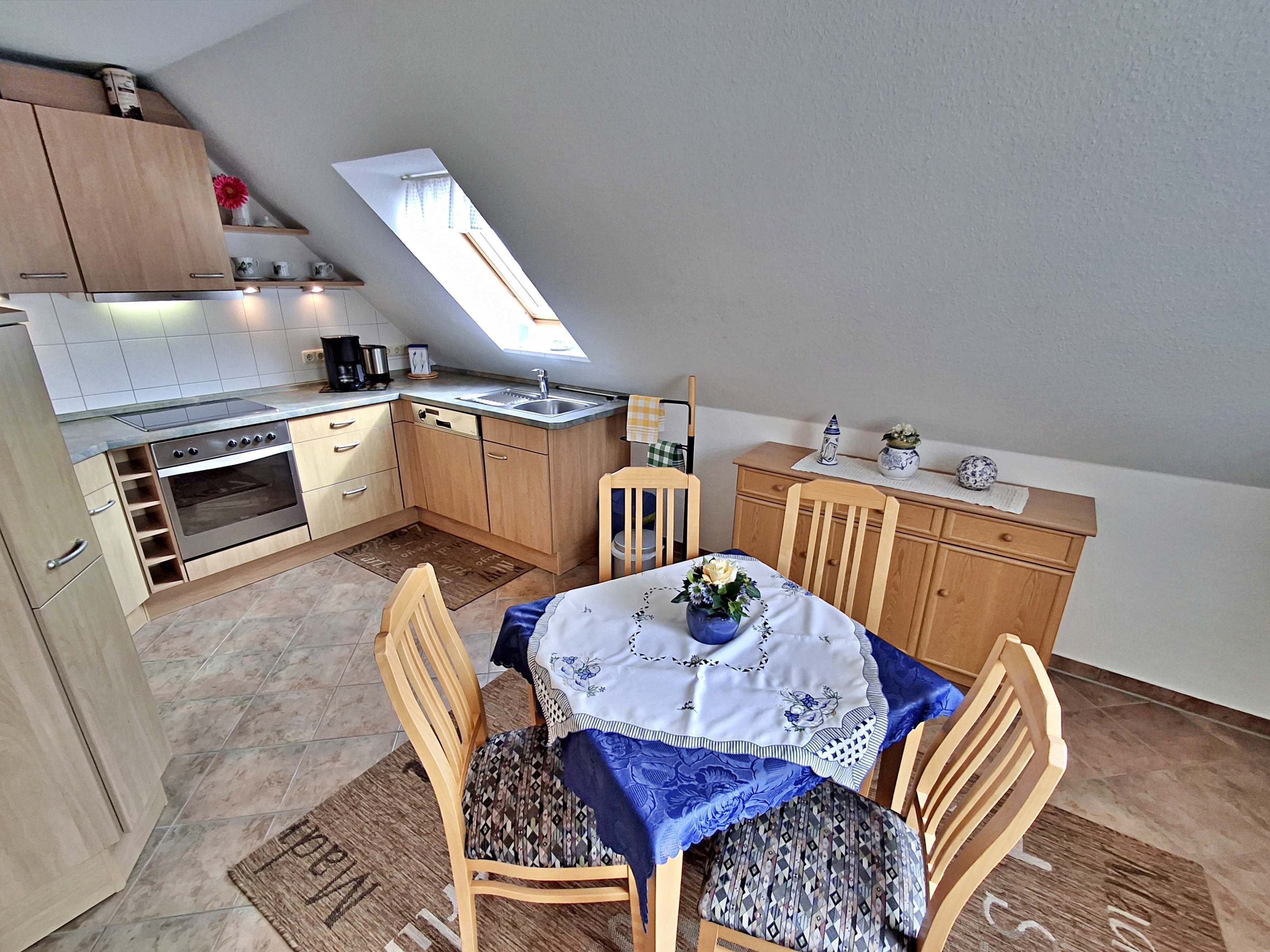 Diese ca. 50 qm große freundliche Unterkunft im 1. OG mit separatem Eingang bietet Ihnen alles, was Sie für einen angenehmen Aufenthalt benötigen. Der einladende Wohnbereich ist mit einer gemütlichen Couch, einem Sessel, TV und Radio ausgestattet, sodass Sie sich nach einem erlebnisreichen Tag entspannen können. Der Essbereich, der an die komplett ausgestattete Küche anschließt, lässt keine Wünsche offen. Hier finden Sie einen Ceranherd, Backofen, Spülmaschine, Mikrowelle, Wasserkocher, Kaffeemaschine und Toaster - perfekt für die Zubereitung Ihrer Lieblingsgerichte. Das separate Schlafzimmer ist mit einem komfortablen Doppelbett und einem Kleiderschrank ausgestattet. Dank des Außenrollos können Sie den Raum nach Belieben abdunkeln. Das Tageslicht-Bad mit Dusche und WC, ebenfalls mit Außenrollo, sowie ein kleiner Abstellraum runden das Angebot ab. Ein besonderes Highlight ist der Balkon zur Südseite, der vom Wohnzimmer aus zugänglich ist. Hier können Sie bereits am Morgen Ihren Kaffee genießen oder den Tag bei einem Glas Wein ausklingen lassen. Bitte beachten Sie, dass Bettwäsche und Handtücher mitgebracht werden müssen. In Ausnahmefällen kann der Vermieter diese gegen eine Gebühr zur Verfügung stellen, was vor Ihrer Anreise abgesprochen werden sollte. Selbstverständlich können Sie das WLAN kostenfrei nutzen.