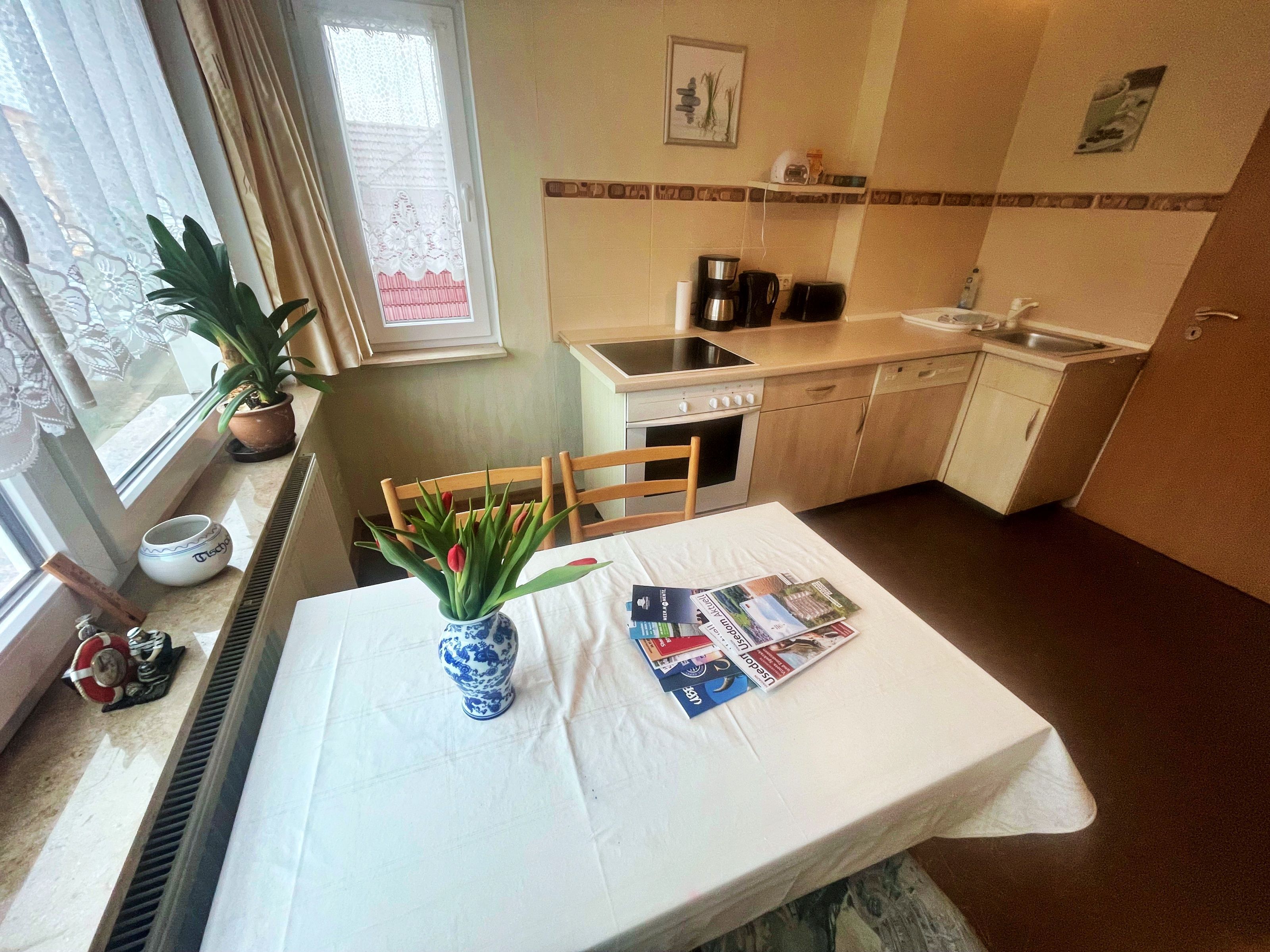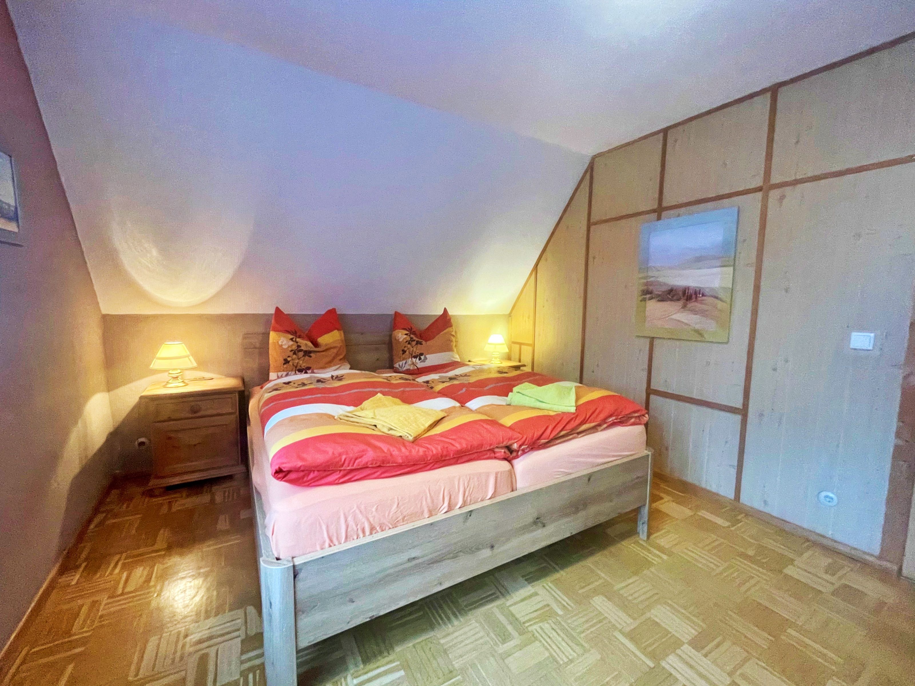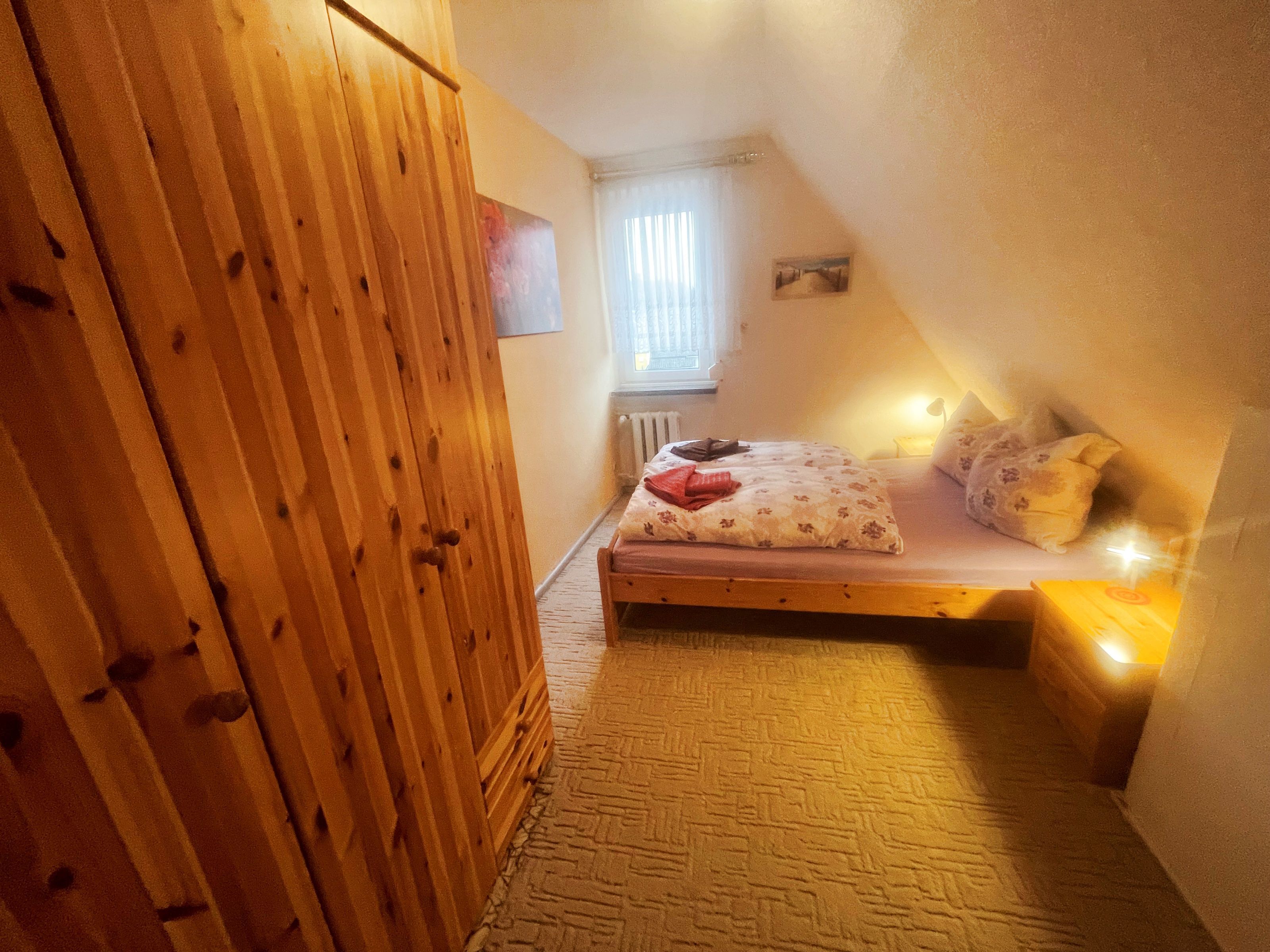 Die gemütlich eingerichtete Ferienwohnung im Obergeschoss des Wohnhaus des Vermieters verfügt über einen separaten Eingang über den Wintergarten, von dort aus gelangt man durch eine Tür ca. 70 cm, zur Treppe, die in die Wohnung führt. Die Ferienwohnung teilt sich auf in ein großes Wohnzimmer mit Couchsitzecke, Wohnwand, Flat-TV und Bibliothek. Das Schlafzimmer verfügt über ein Doppelbett und einen geräumigen Kleiderschrank. Das zweite Schlafzimmer verfügt über ein Doppelbett (1,40 x 2 m) und einen Kleiderschrank. Die helle, gut ausgestattete separate Küche verfügt über einen 4-Platten-Ceranherd mit Backofen, Geschirrspülmaschine und Kühlschrank sowie einen schönen Essplatz für 2-4 Personen. Das Badezimmer verfügt über eine Glasdusche und WC sowie Haartrockner. Die Erstausstattung Bettwäsche und Handtücher, Endreinigung sowie der Parkplatz sind im Preis inklusive.