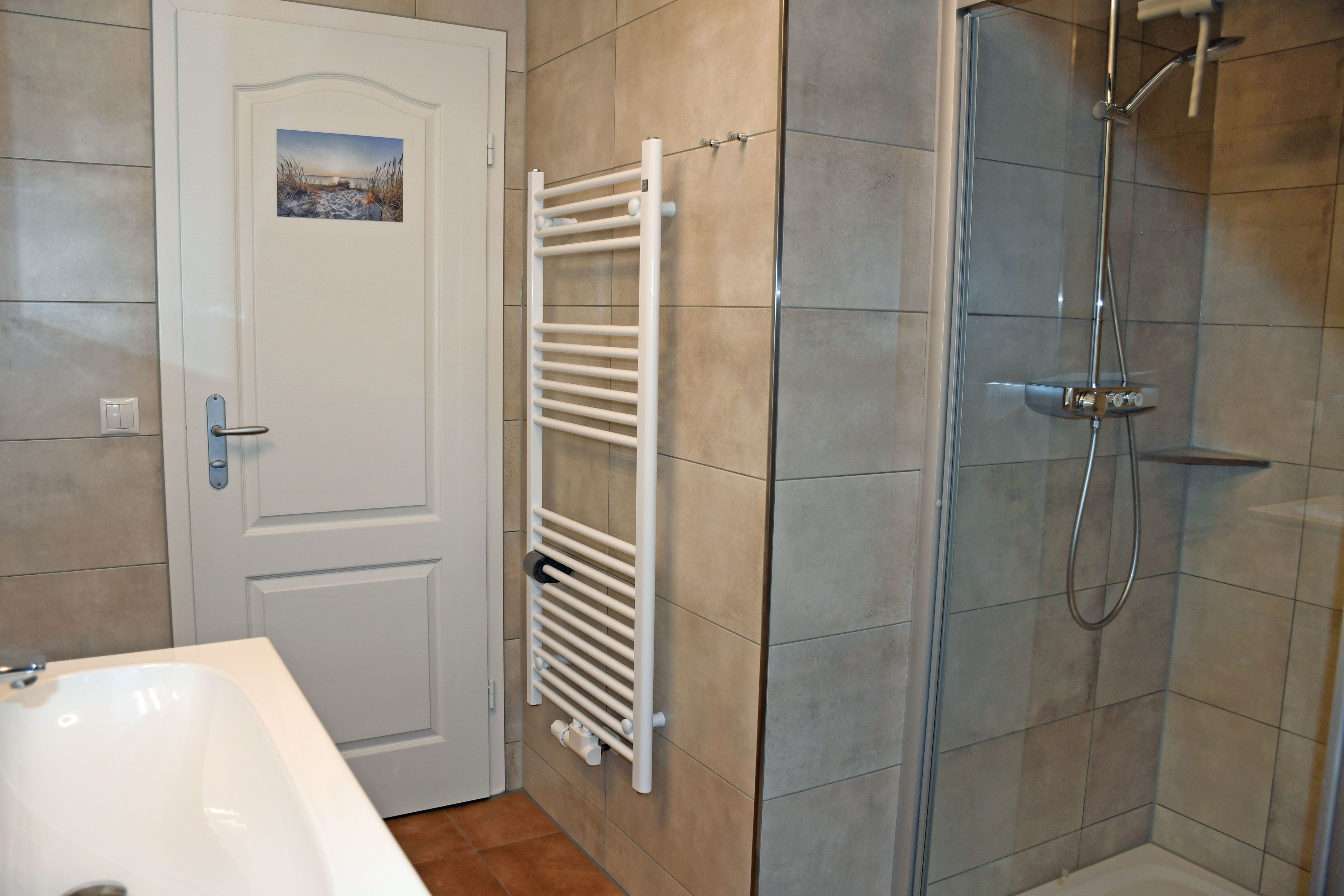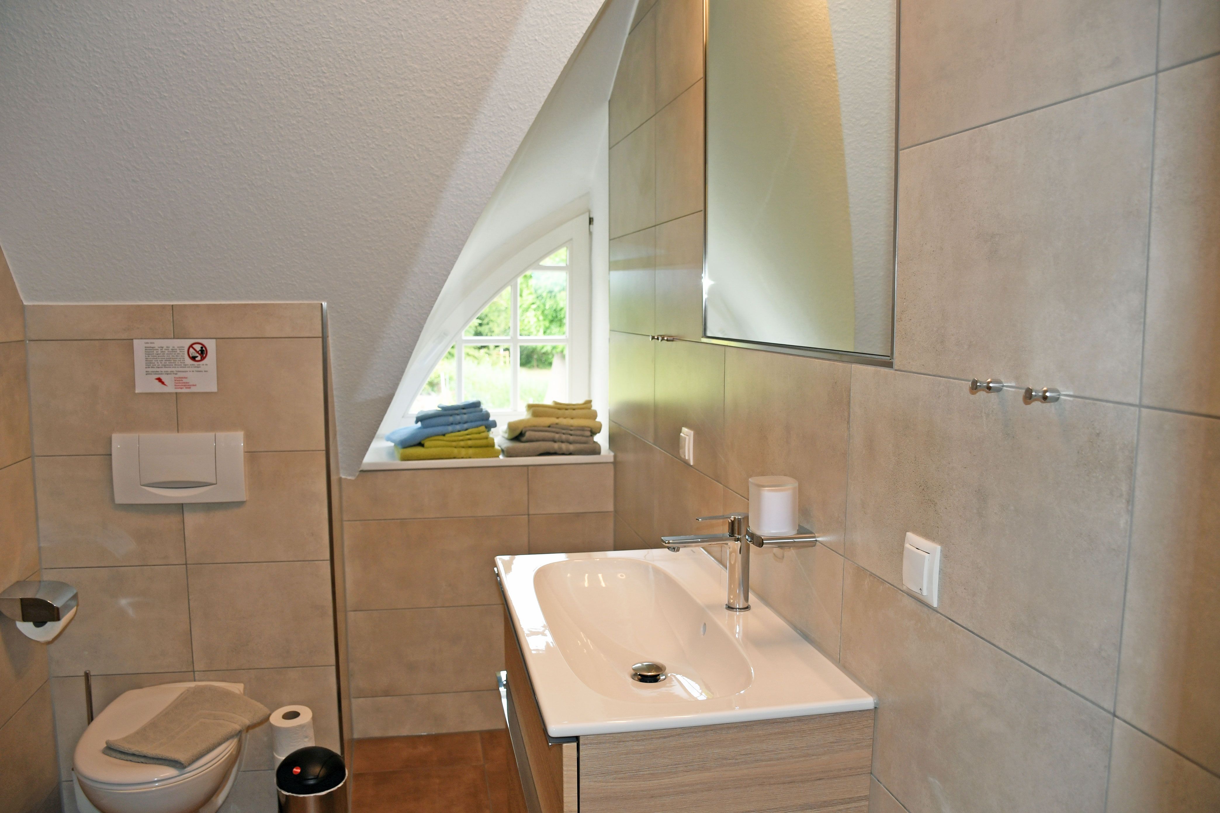 Das helle Tageslichtbad mit Dusche sorgt für den notwendigen Wellnessfaktor.