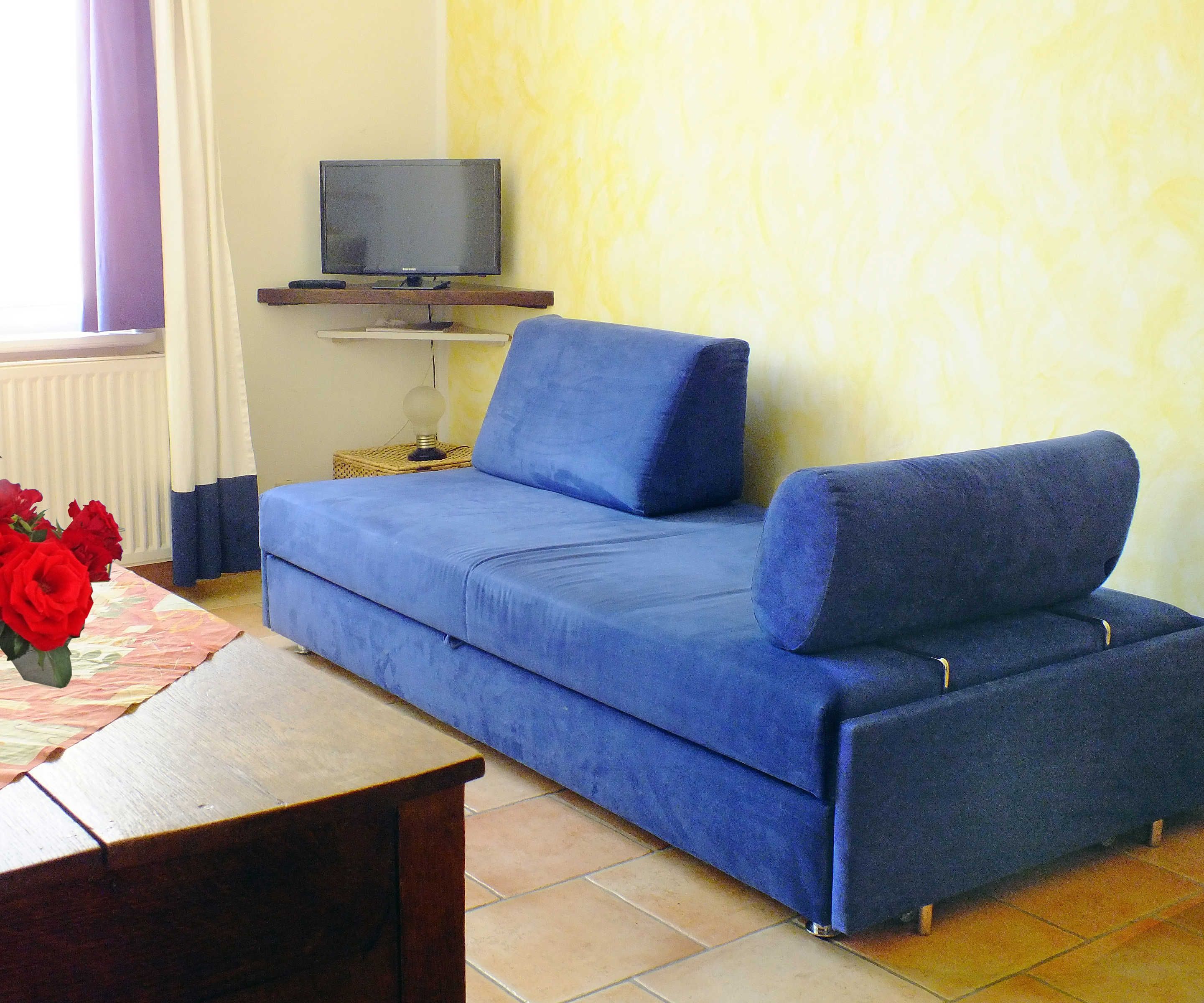 Dieses moderne, kleine 1-Raum-Appartement (vollständig gefliest) mit 22 qm befindet sich im Erdgeschoss und verfügt über einen kombinierten Wohn- und Schlafraum mit einem Kleiderschrank, TV, Esstisch mit Stühlen, Kommode, einem qualitativem Bali-Sofa-Bett mit einer Liegefläche von 1,80 x 2,00 m sowie einer Küchenzeile mit 2-Platten-Herd, Spüle, Kühlschrank, Kaffeemaschine, Toaster, Geschirr uvm. Das Bad ist mit DU/WC ausgestattet.