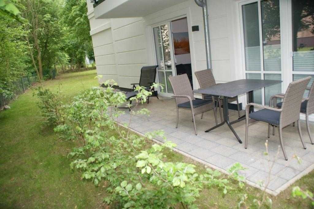 Über das Wohnzimmer und Schlafzimmer gelangen Sie direkt zur nach Süden ausgerichteten Terrasse und in den Gemeinschaftsgarten mit altem Baumbestand. Die Terrasse ist mit Tisch und Relaxstühlen und einer Liege ausgestattet.
