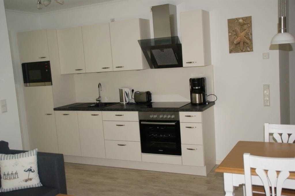 Die hochwertige Einbauküche verfügt über einen Herd mit 4-Platten Ceranfeld und Backofen, einen Kühlschrank mit Gefrierfach, Mikrowelle, Geschirrspüler, Kaffeemaschine, Wasserkocher und Toaster.