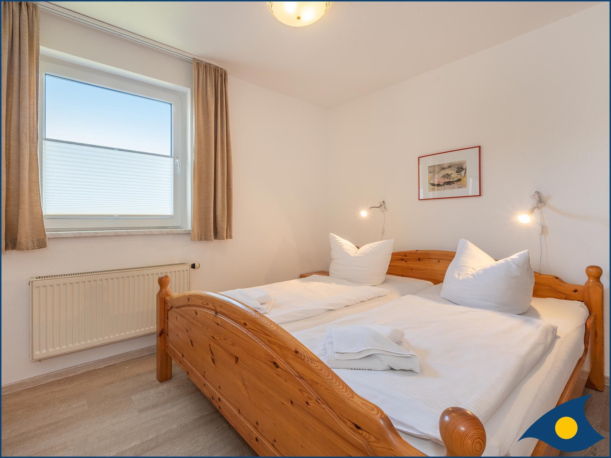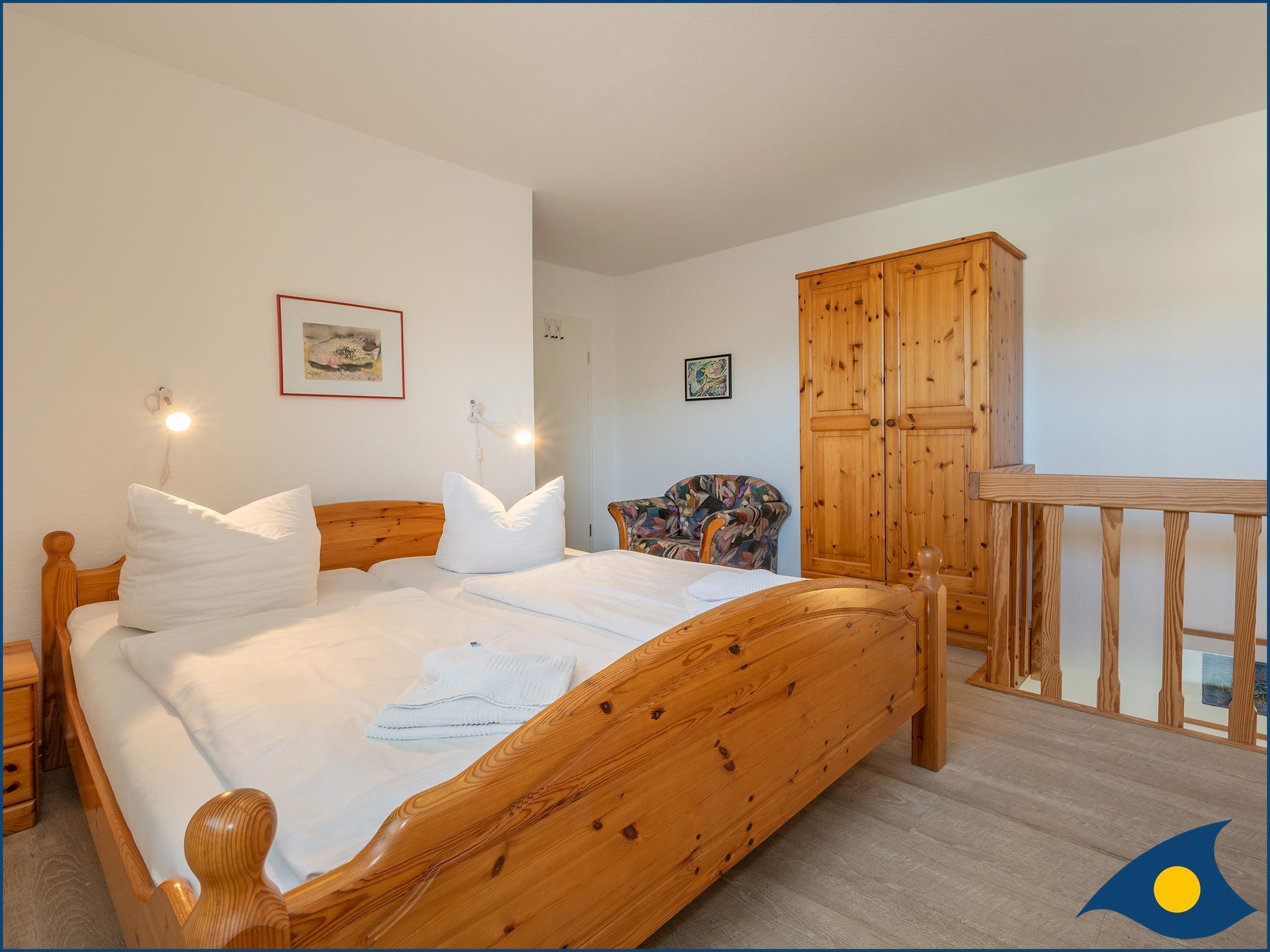 In den Obergeschossen befinden sich zwei Schlafzimmer mit Doppelbett. Die Kleiderschränke bieten genug Platz für Ihre Urlaubsgarderobe.