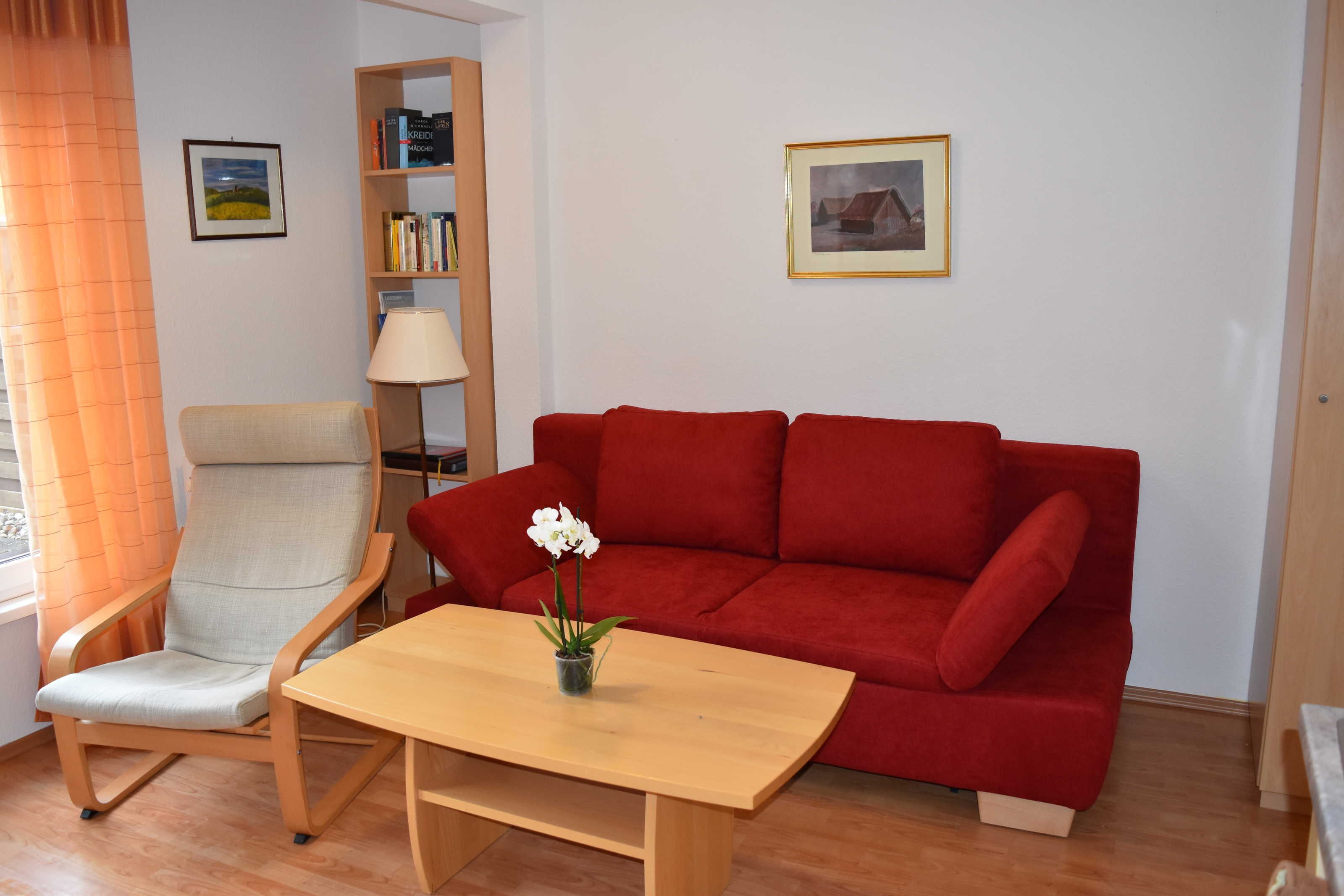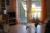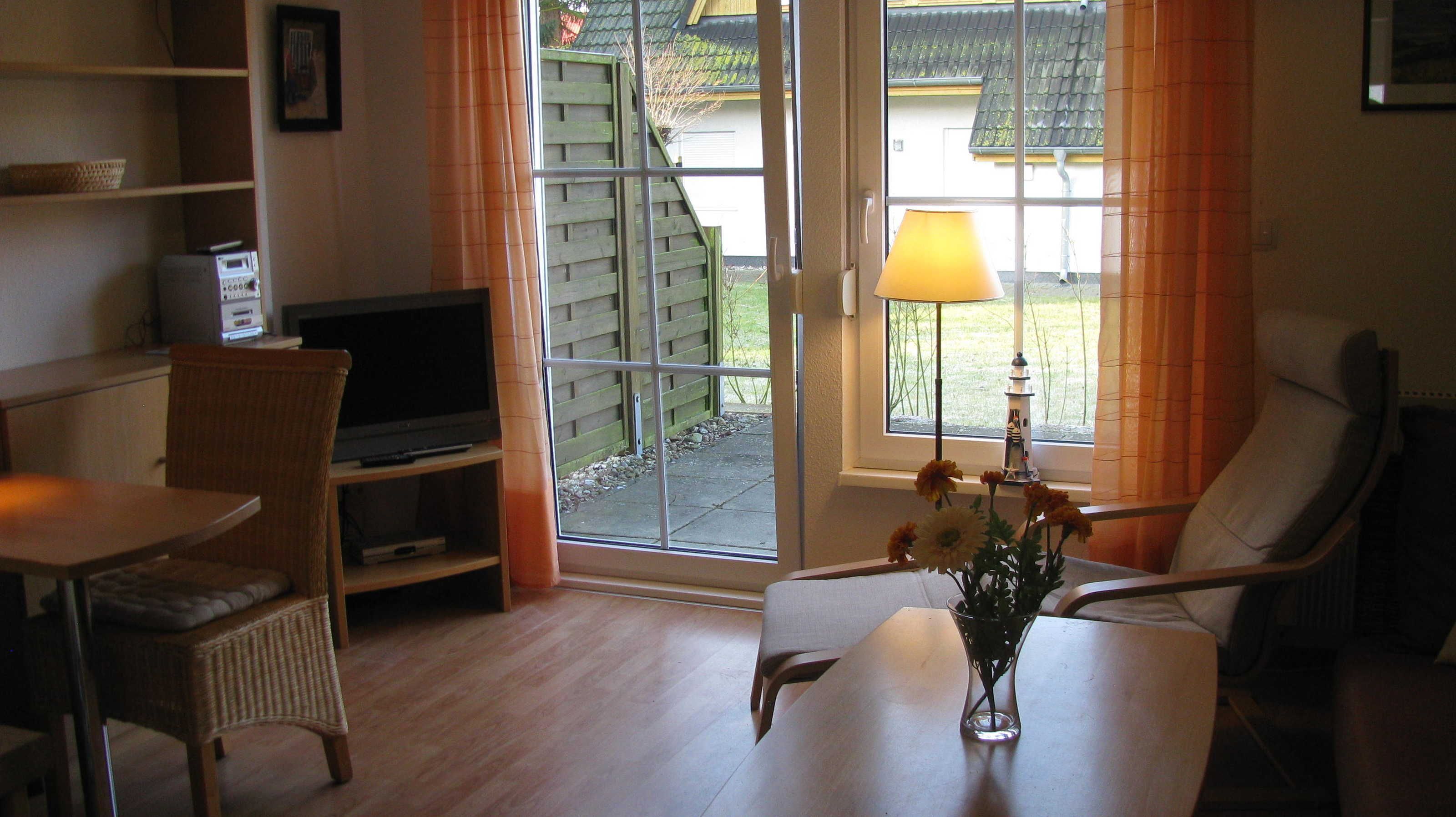 2-Zimmer Ferienwohnung im Erdgeschoss einer liebevoll angelegten Ferienanlage. Die Ferienwohnung ist im Wohnbereich ausgestattet mit einer gemütlichen Couch und einer offenen Küche mit Essbereich.
