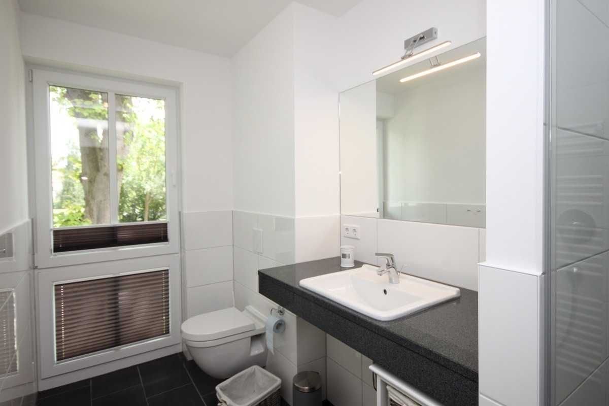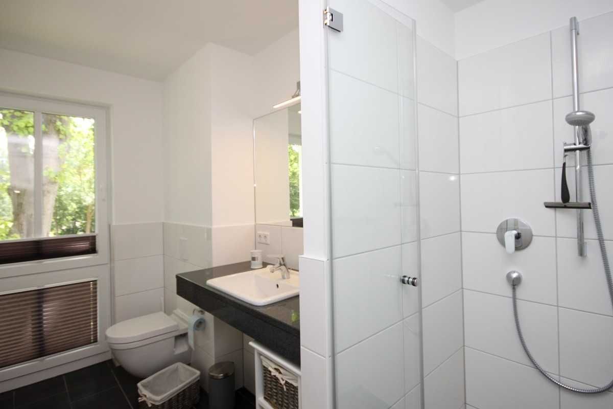 Das Bad mit Tageslicht ist mit einer bodengleichen Dusche, einem großen Waschtisch, einem großen Wandspiegel und einen Haartrockner ausgestattet.